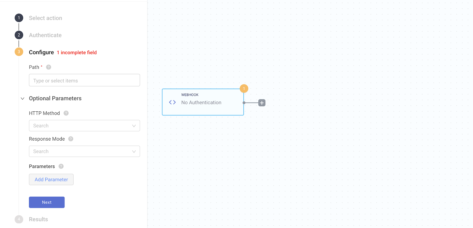 Next, you’ll be asked to configure the webhook path, response mode, and method.