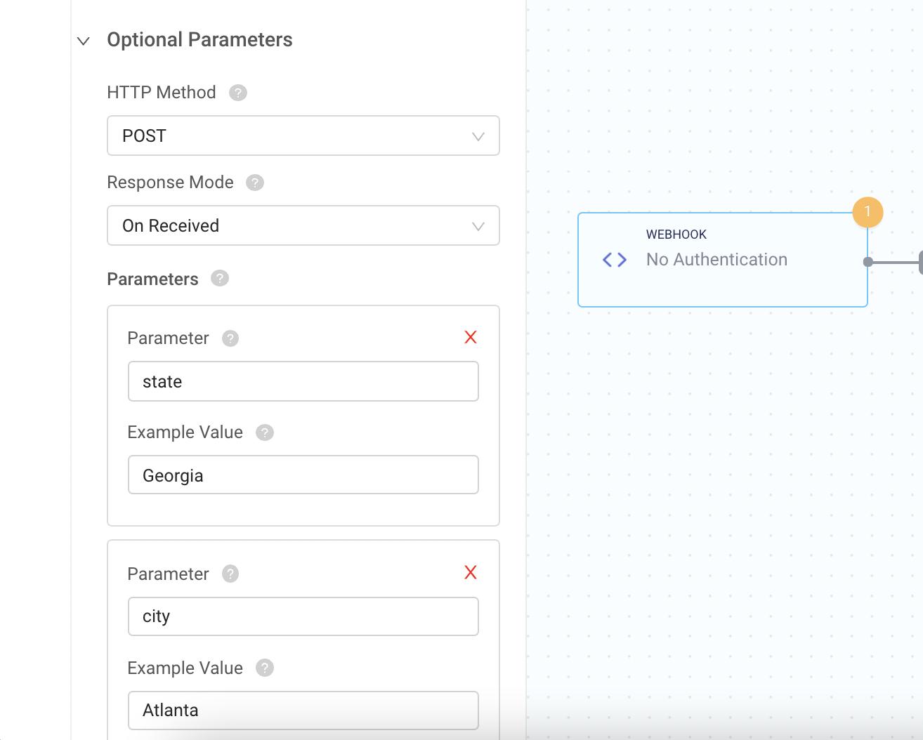 Let’s create two parameters, one called state with a sample value of Georgia, and one called city with a sample value of Atlanta, as seen below.