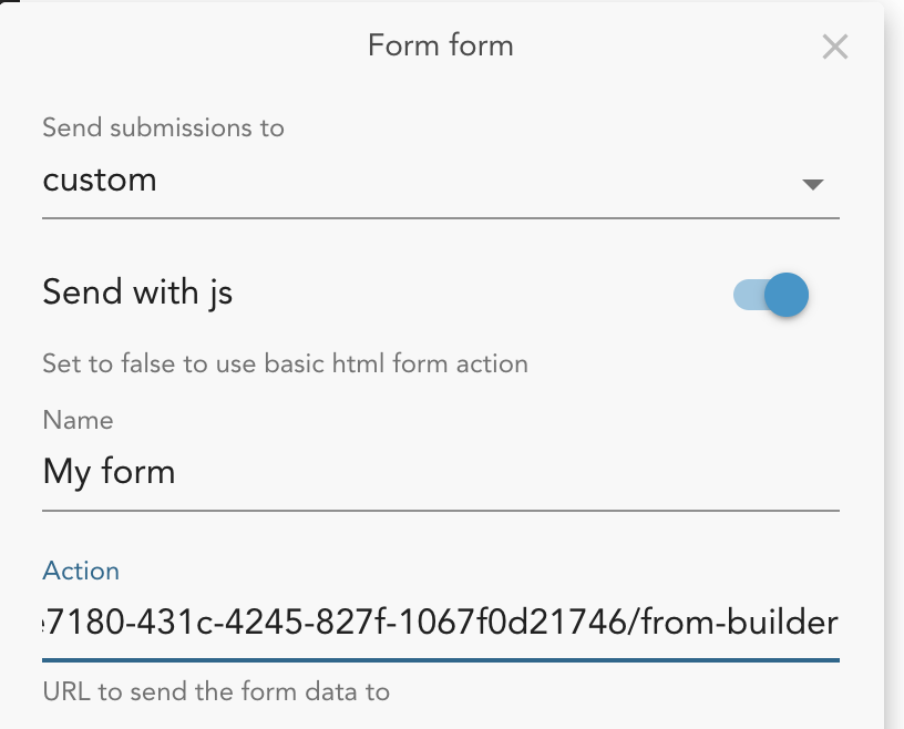 Create a form component and set Send submissions to custom.