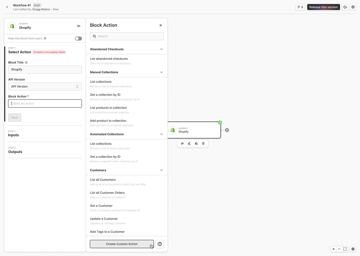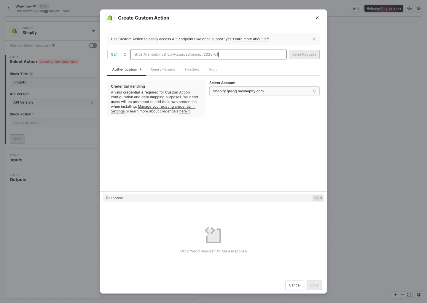 Let's assume Shopify has just added a new create order endpoint to their APIs and Alloy has yet to add support for that endpoint. With Custom Action, we can add this new endpoint to our workflow. To demonstrate, let's add an endpoint that allows users of your app to fetch all orders from their Shopify store.