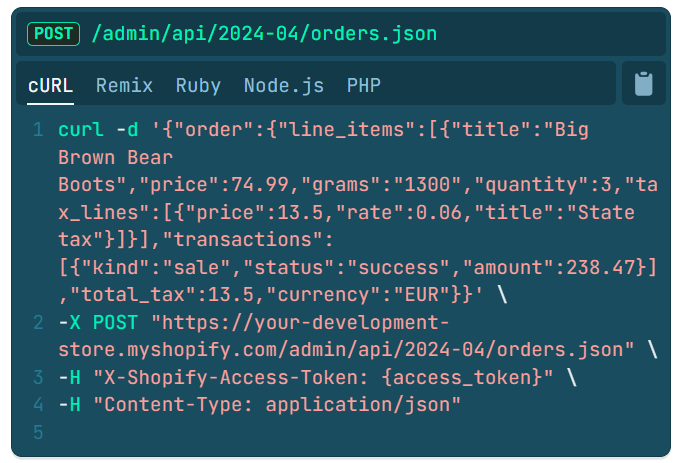 - Next, we will select our Request Method and add our URL. This is where Shopify's API docs come in handy once more. We will use the POST method along with the endpoint highlighted in the screenshot below. We do not need to include anything before