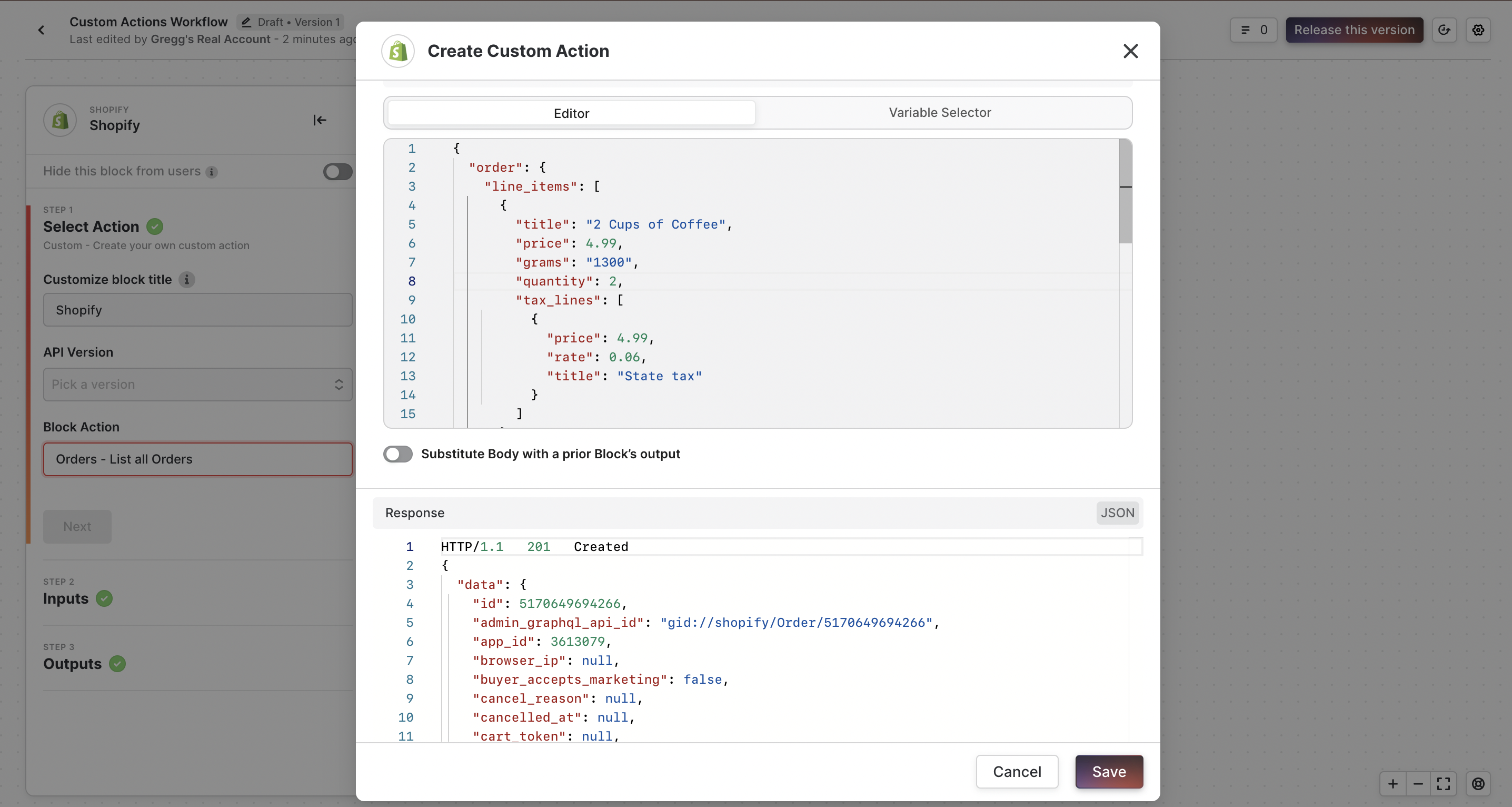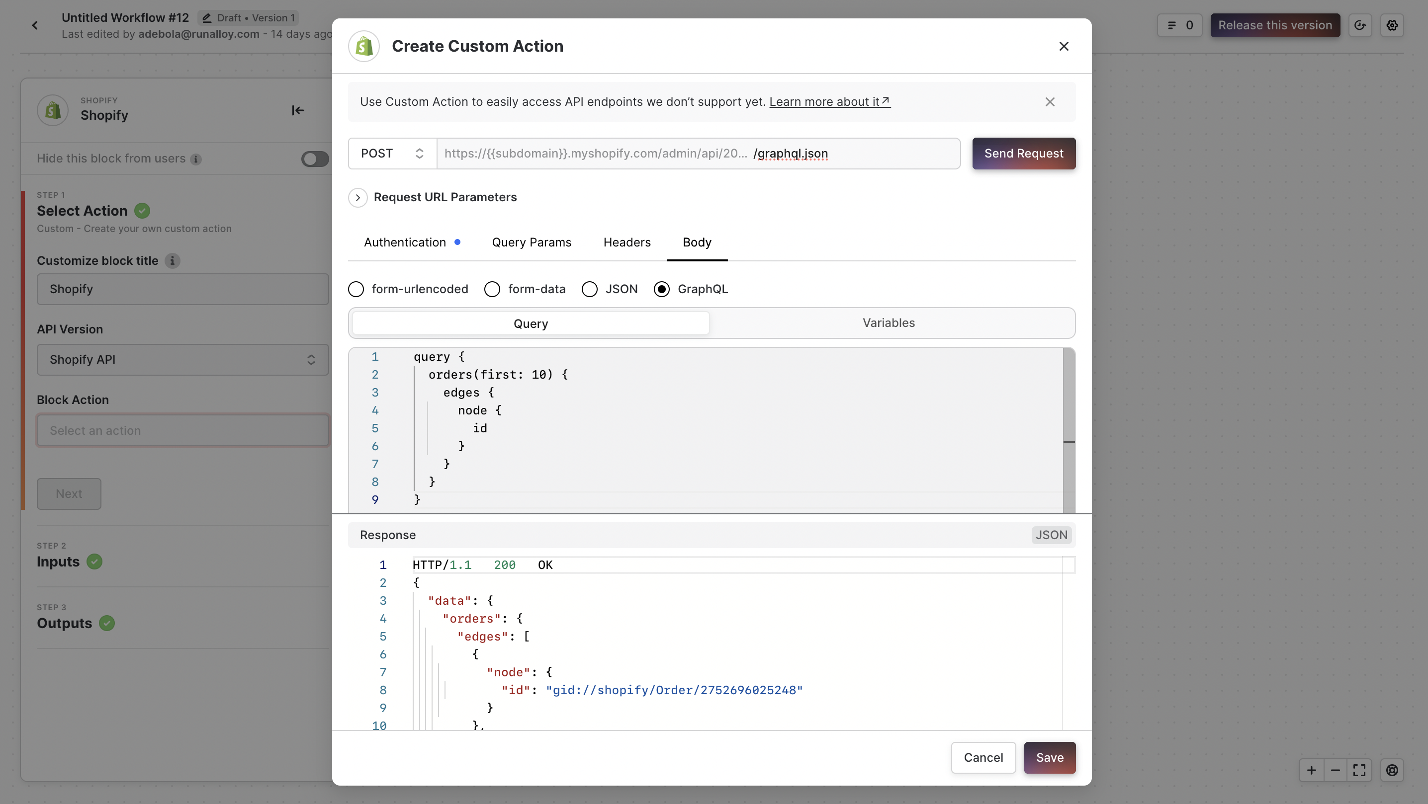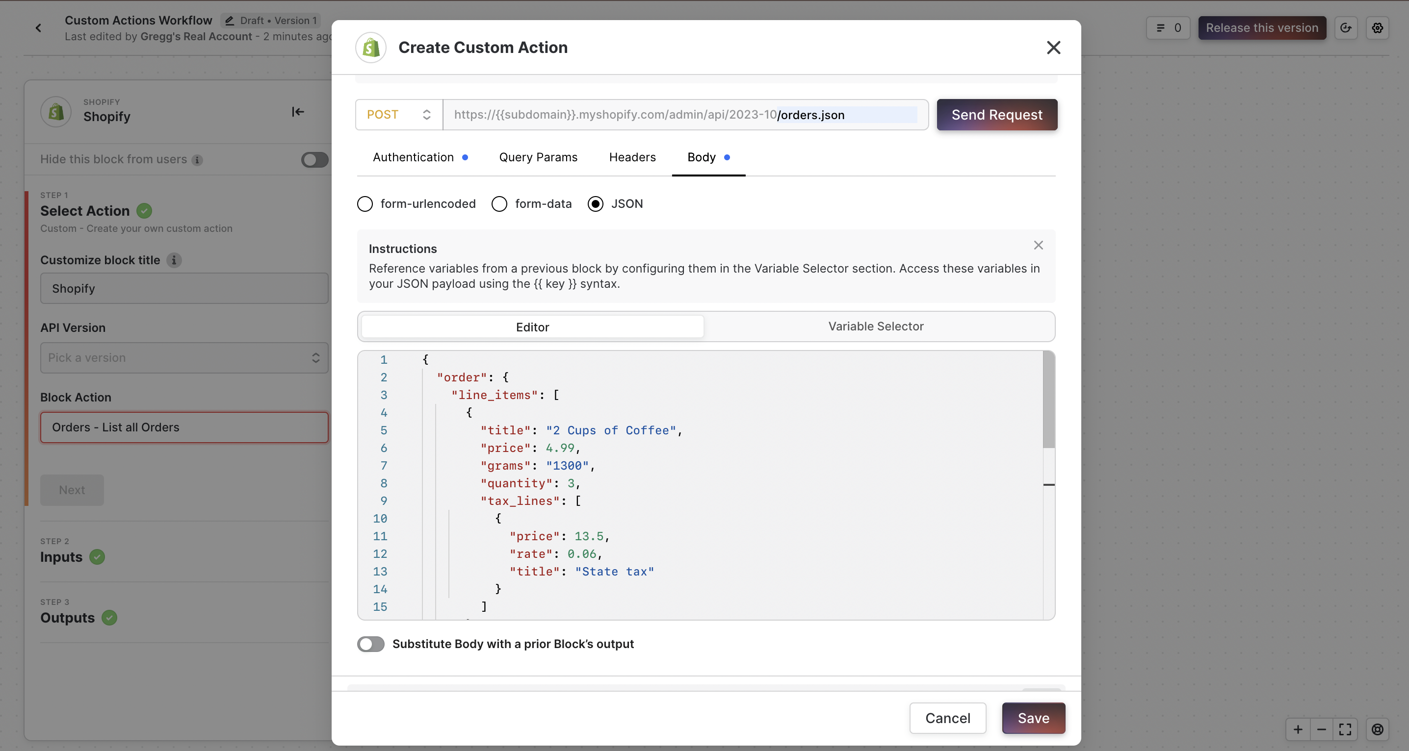 - Now, you're able to configure any additional query, header, and body parameters. Here's a look at the request body when using Custom Action to make a POST request to Shopify's "Create an order" endpoint.