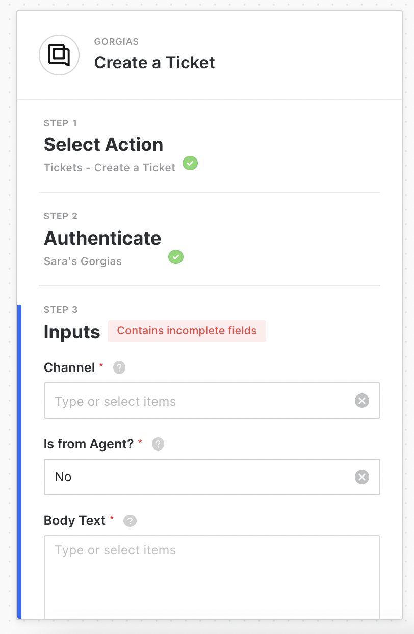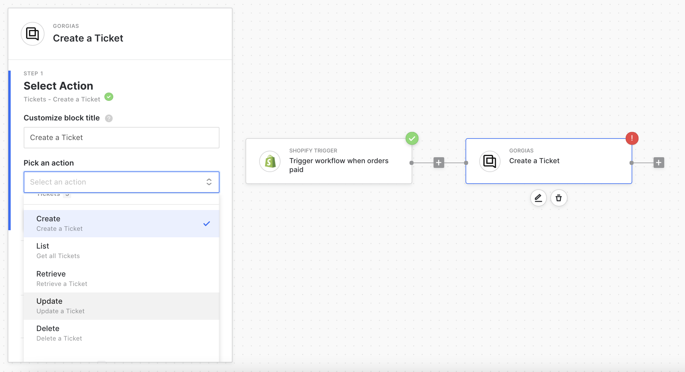 Choose Gorgias as the second block in your workflow by clicking on the + icon next to the trigger