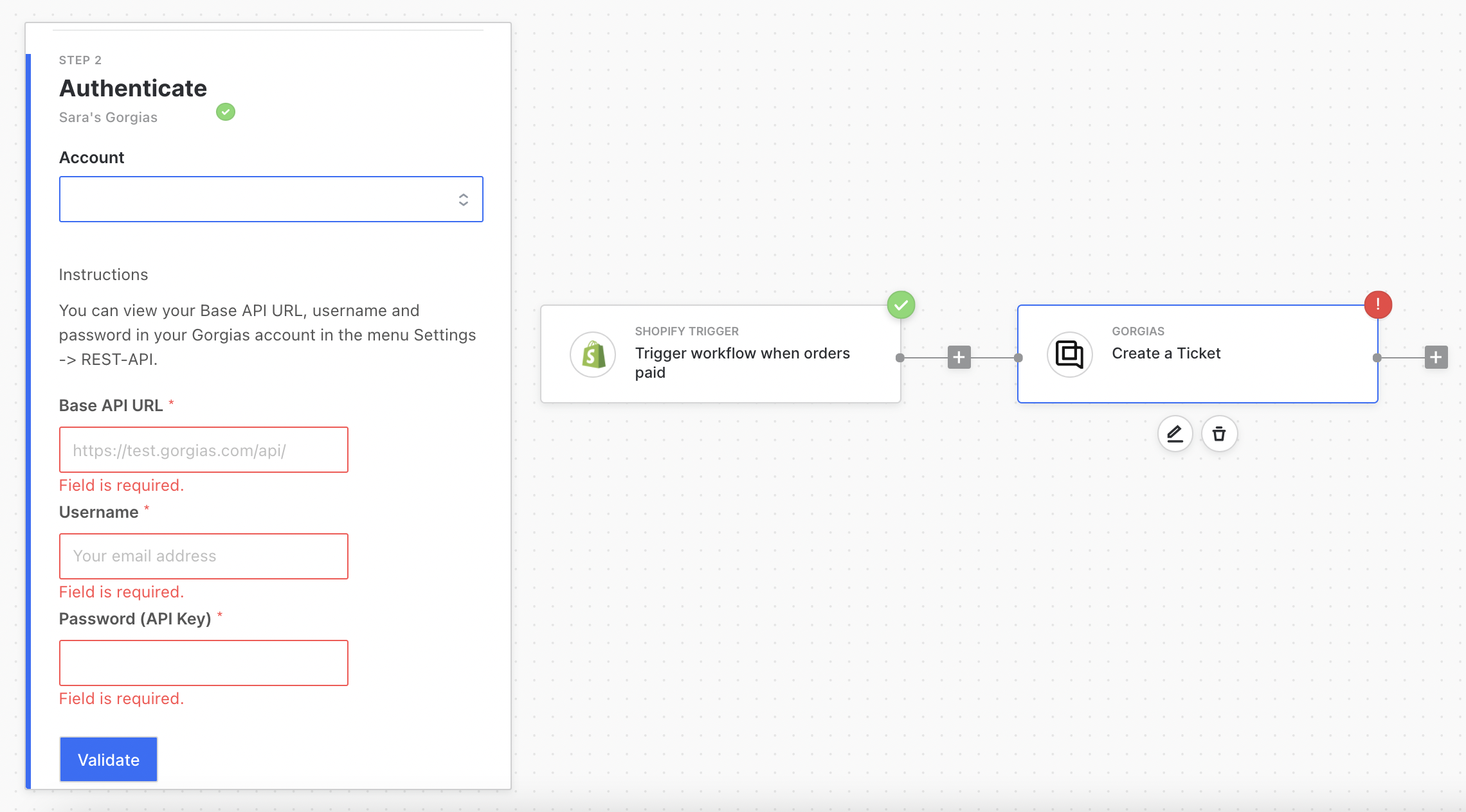 In Step 2, paste your Gorgias credentials into the field then press Validate. To get Gorgias credentials, Login to Gorgias > Go to Settings -> REST-API to view the credentials