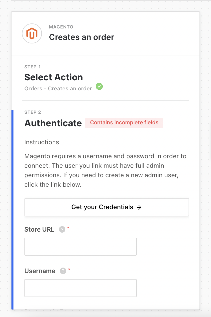 In the next step, you'll need to authenticate your Magento store. More details can be found in Magento's documentation. You'll need to fill out the fields in your Magento block: