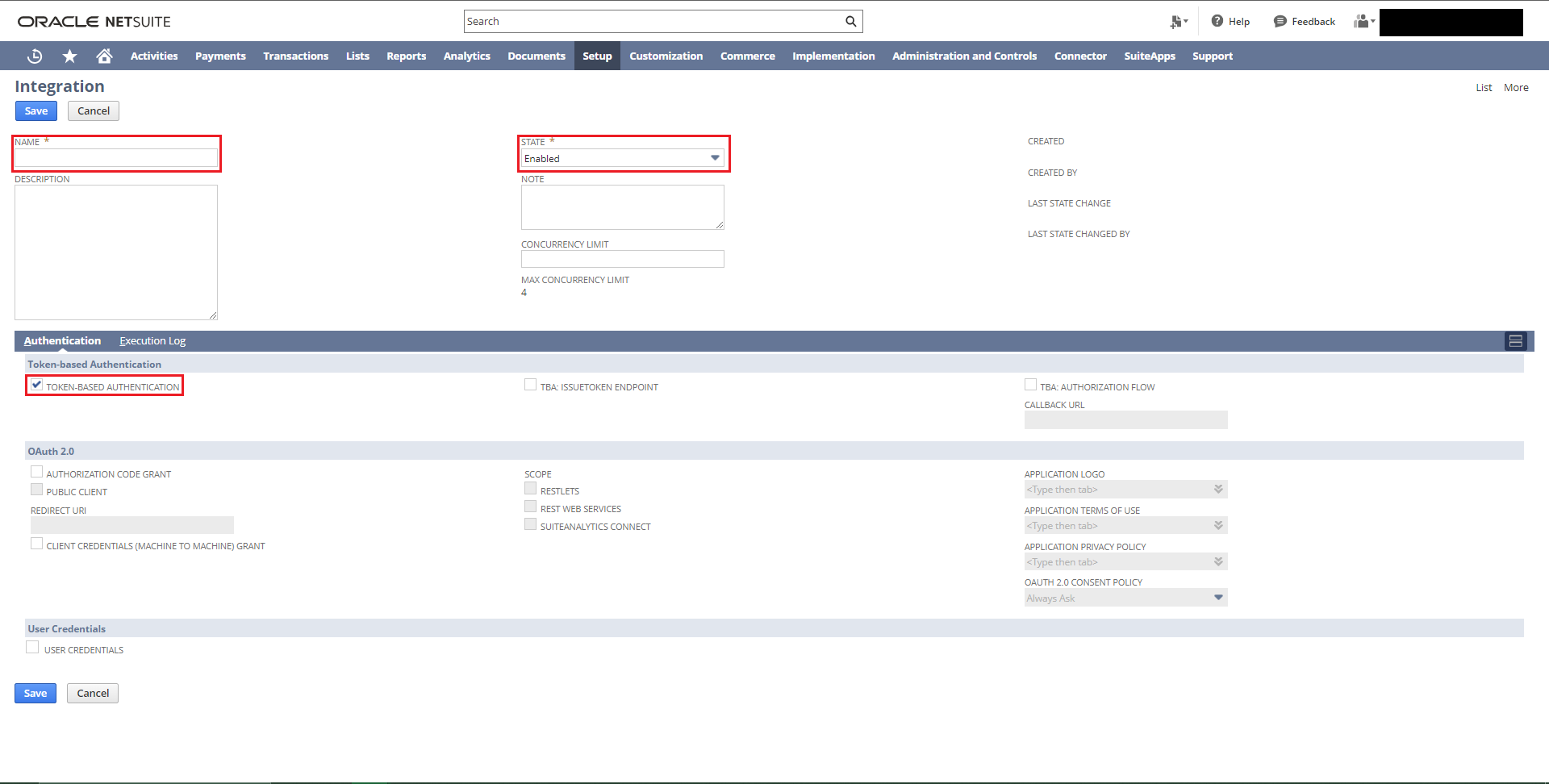 From here, you'll need to create the integration. Give the integration a name, set the state as enabled and select "Token-Based Authentication" as the Authentication Sublist.