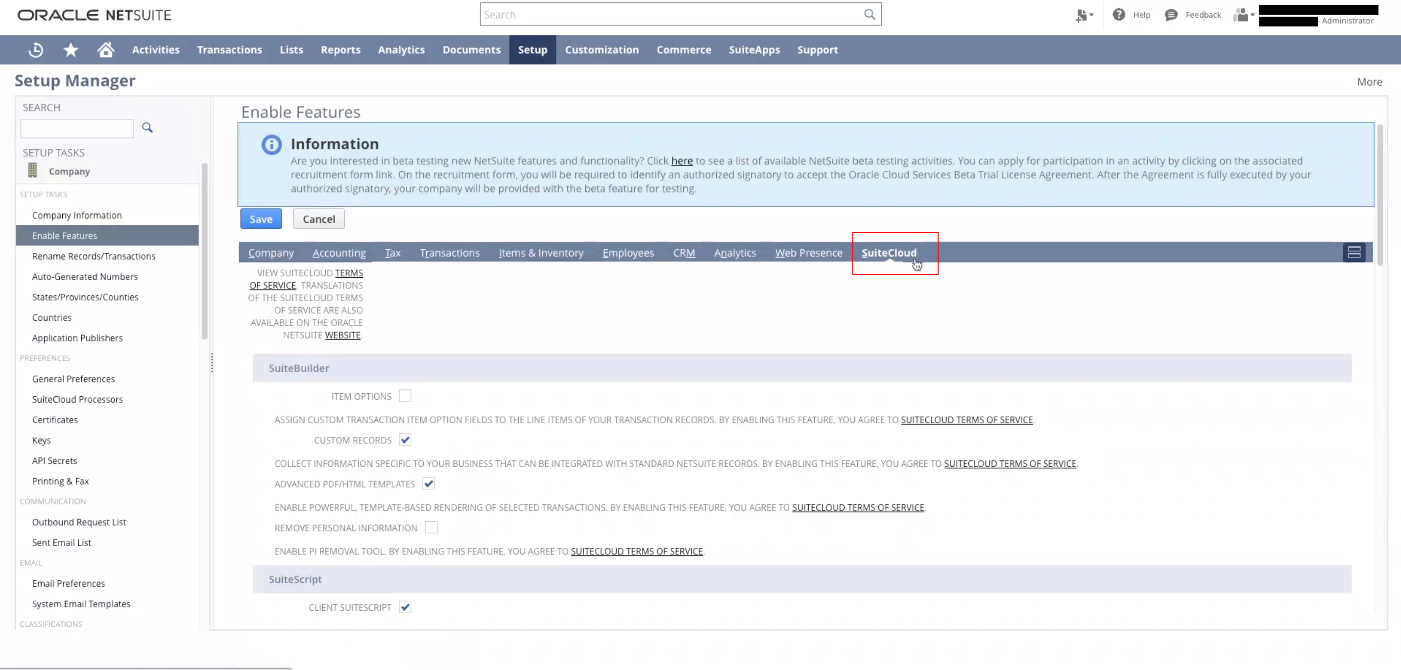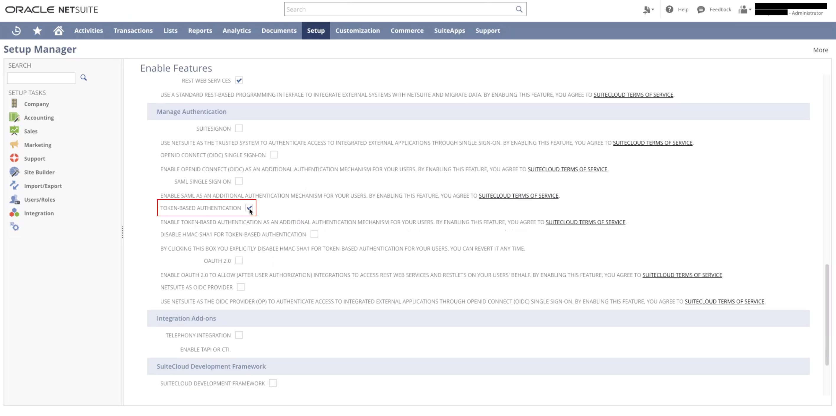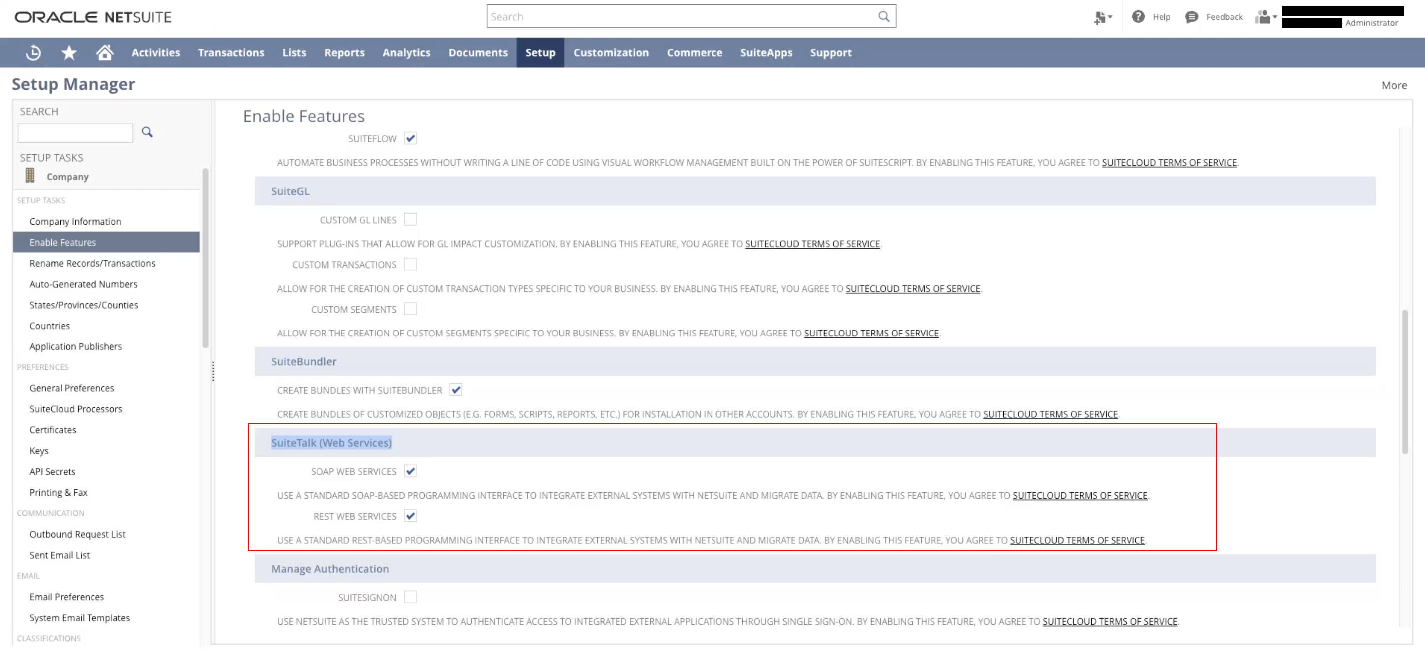 Next, you'll need to enable Token-based Authentication in your NetSuite account. To do so, navigate to Setup > Company > Enable Features > **SuiteCloud **> then scroll down until you see SuiteTalk Web Services.
