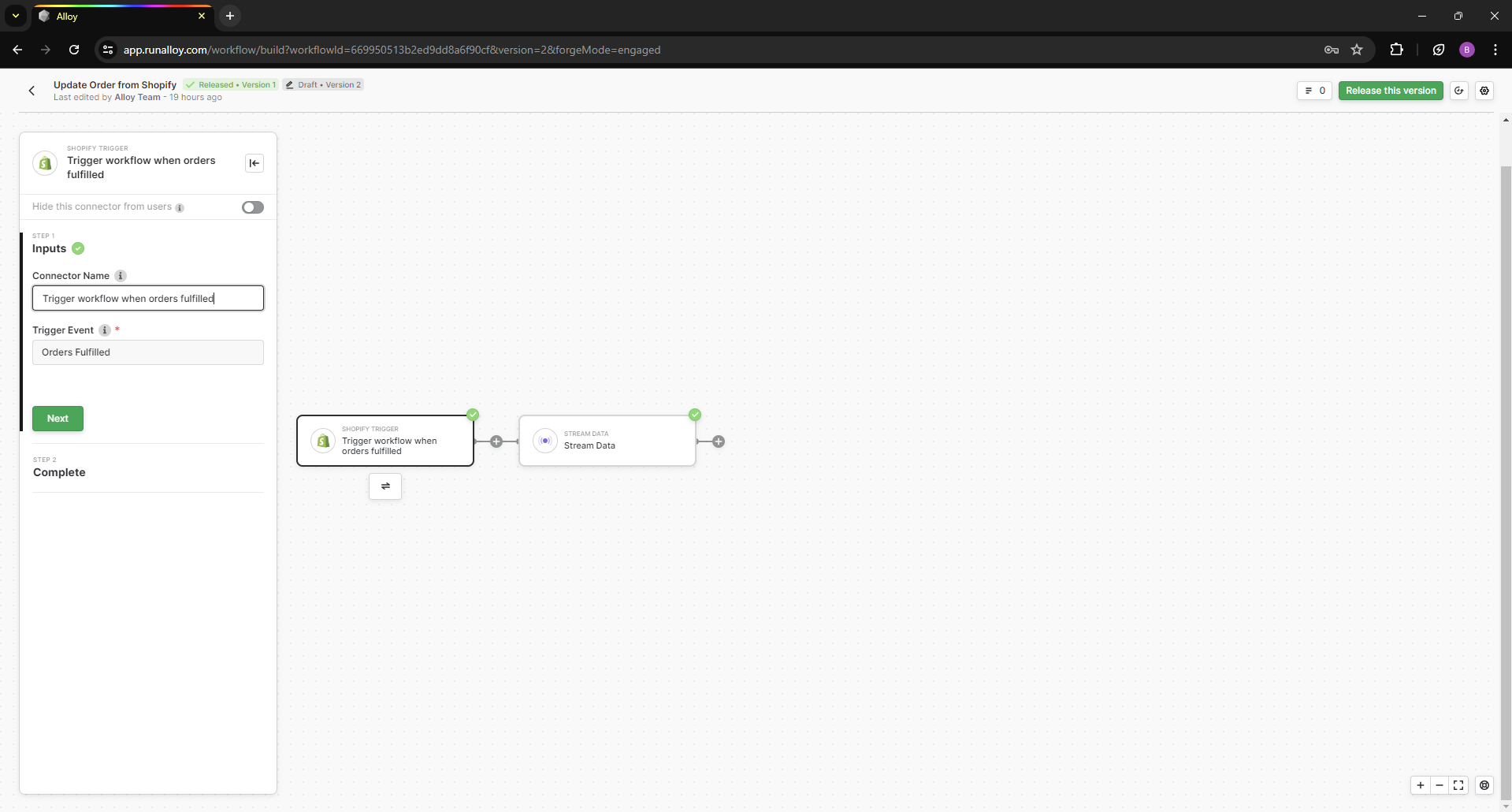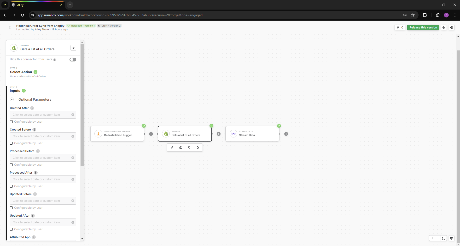 Lastly, add a Stream Data connector. This connector will tell Alloy where to send all the order records to. Specify a destination URL of your choosing. You can see an example of this workflow below.