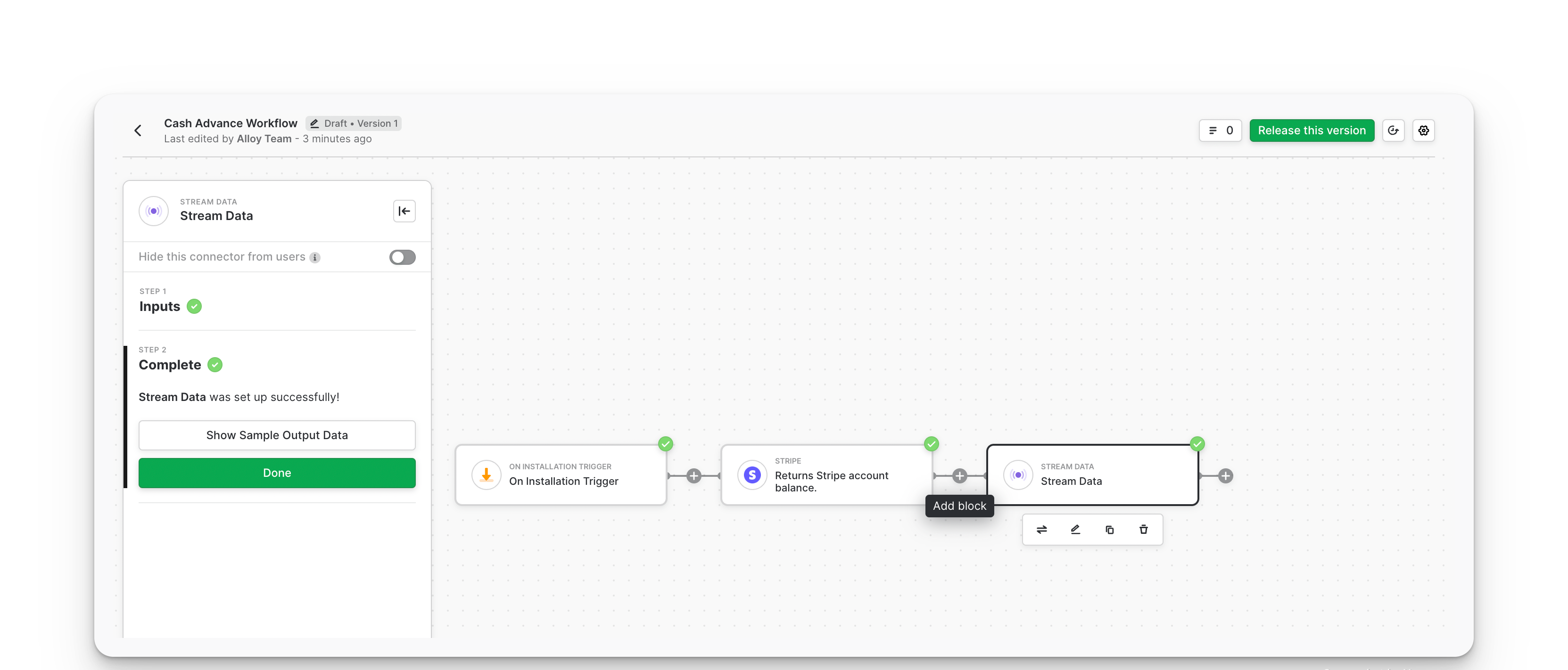 Finally, search for and select the stream data block. This block accepts a Webhook URL for your server. Alloy sends the stripe balance data obtained when a merchant connects to your app to this Webhook URL.