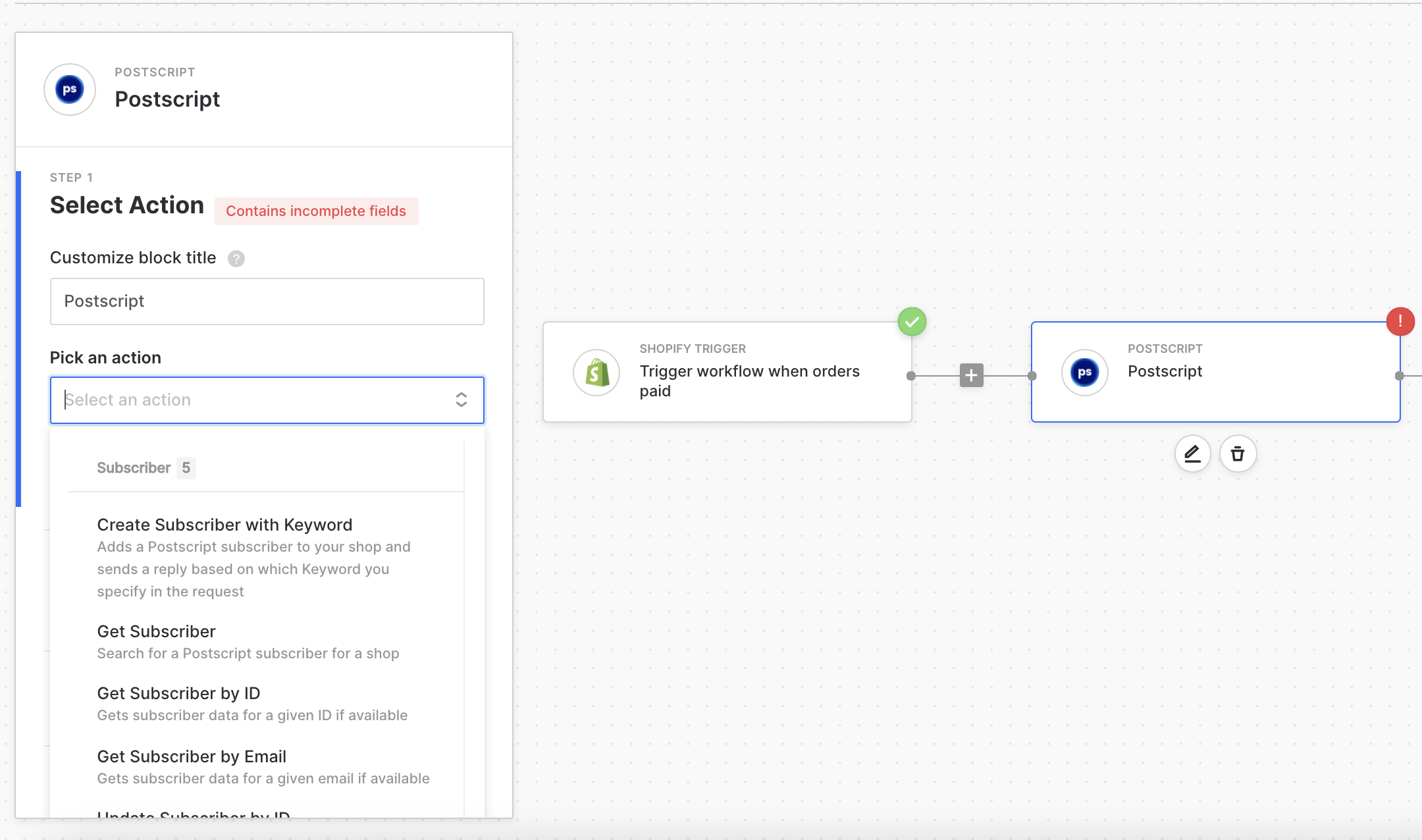 Choose Postscript as the second block in your workflow