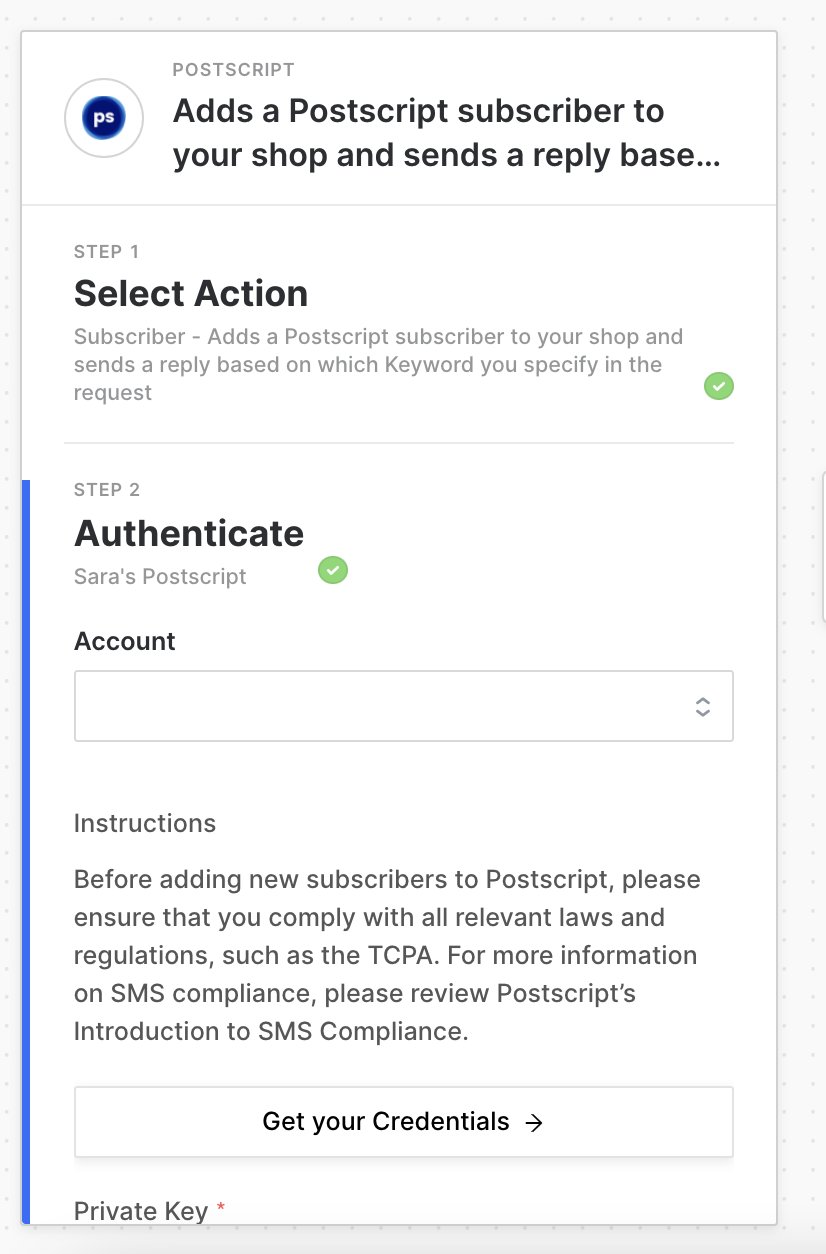 In the Step 2 Authenticate step, paste your Postscript Private Key into the field then press Validate