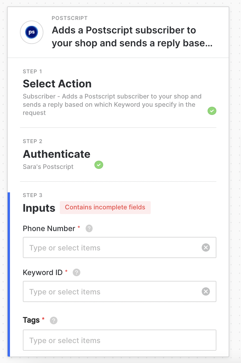 Proceed to the Step 3 Configure step and fill in the required fields. Note that if you use keywords, you'll need to go to Postscript and create a new keyword you want to use to track opt ins from this source