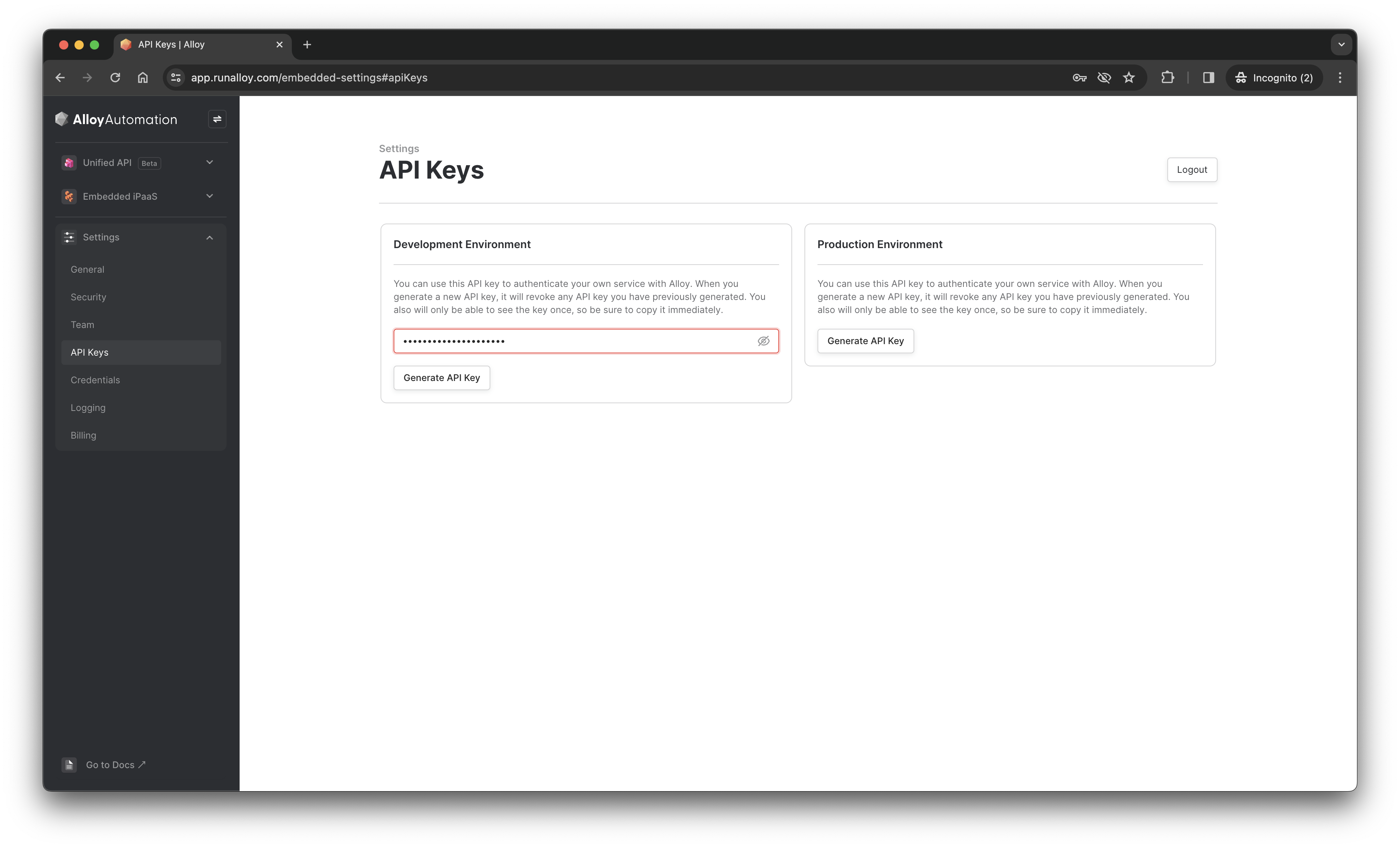 Navigate to the Embedded Settings page. From here, select API Key and under the Development Environment box, click Generate API Key. Since we’re just building, we’ll want to use this key for testing purposes. When you’re ready to go live, make sure to switch to the Production Environment key.