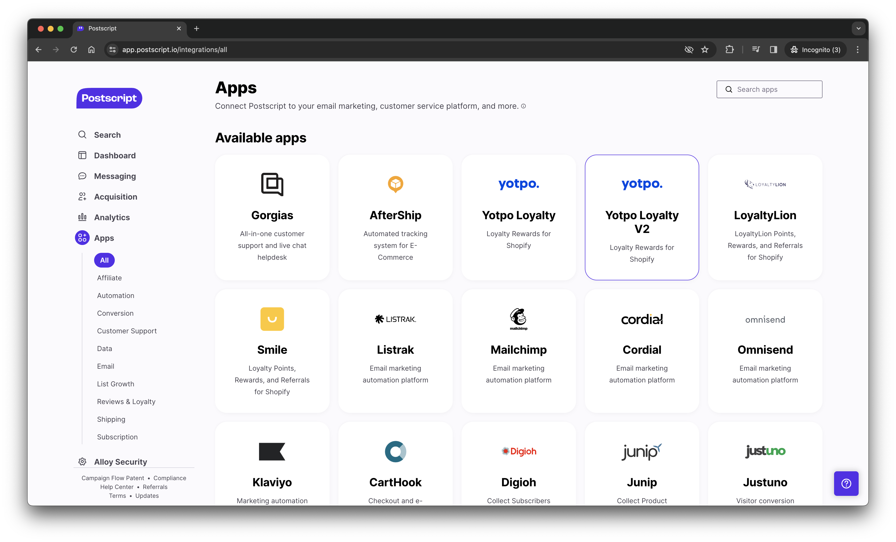 To see this in action, below you'll find an example of Postscript, an Alloy Embedded customer, using the Get List Integrations endpoint to power their apps page.