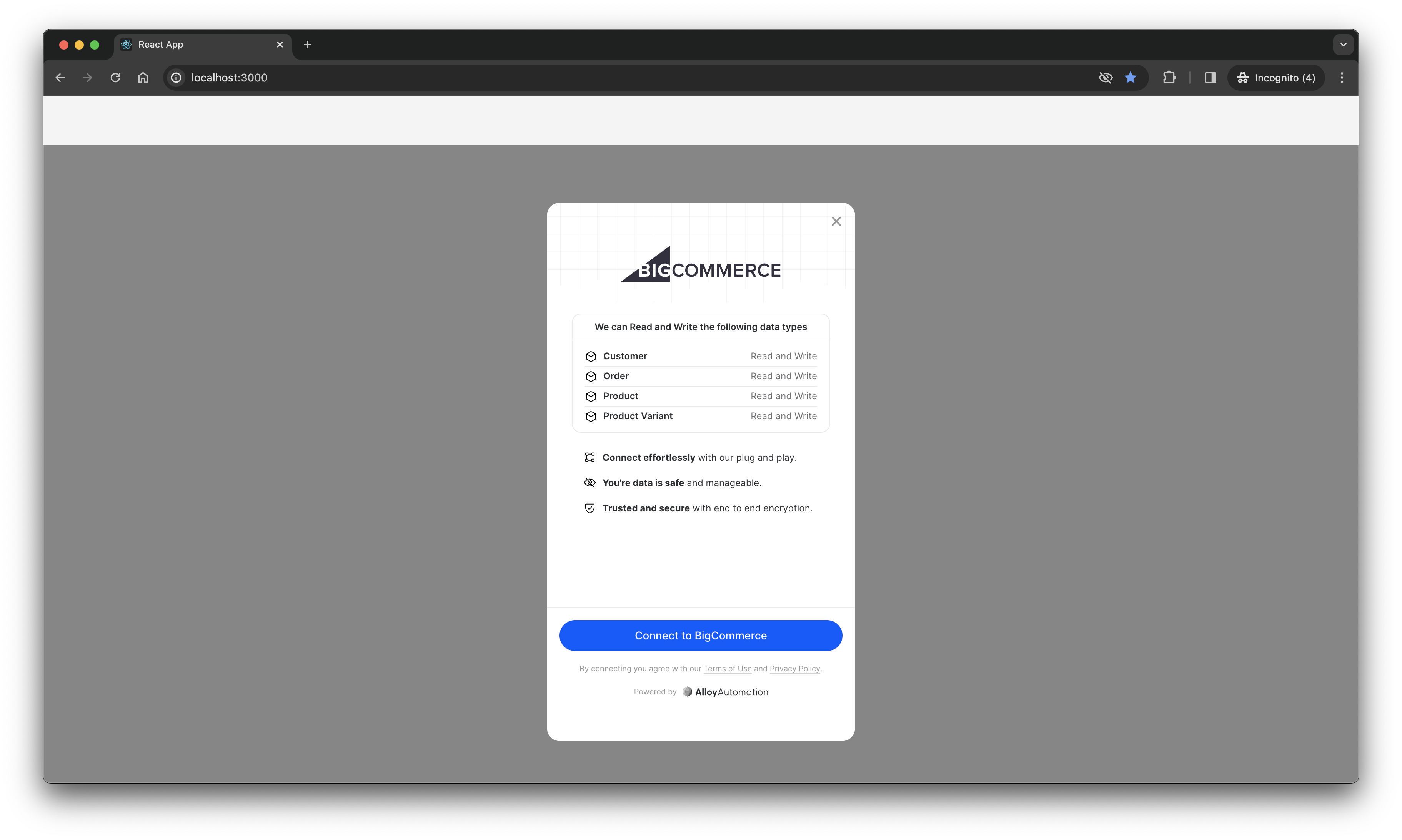 In Figure 1.2 below, you’ll find an example of the Alloy Modal showcasing our BigCommerce integration.