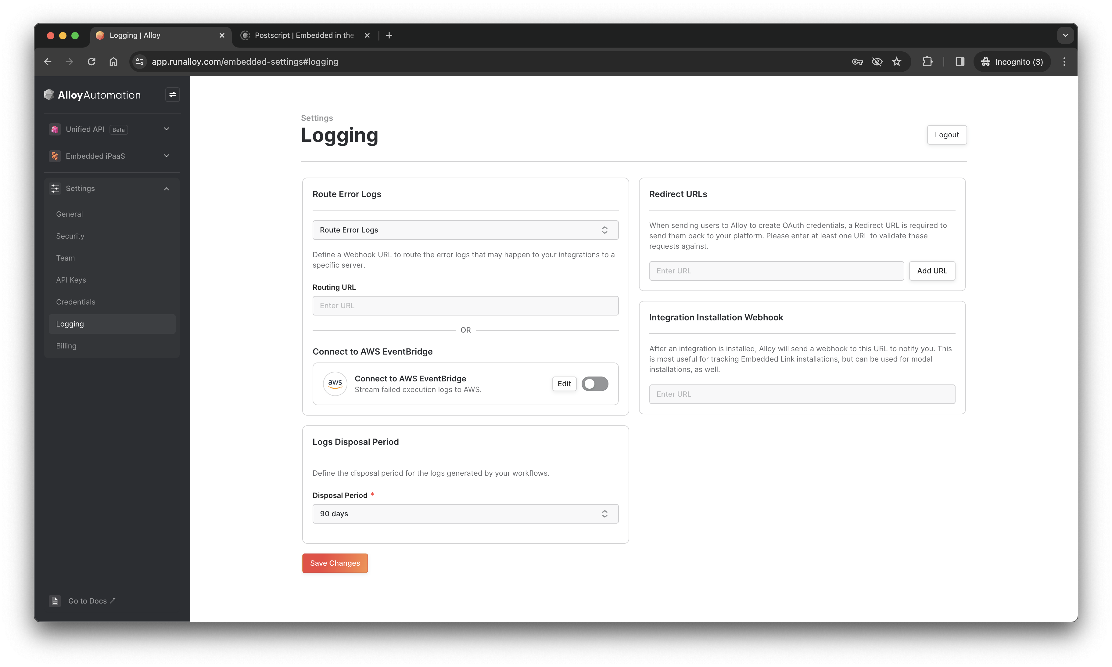 You can also select the Connect to AWS EventBridge option to configure Alloy Embedded to stream error data there as well.