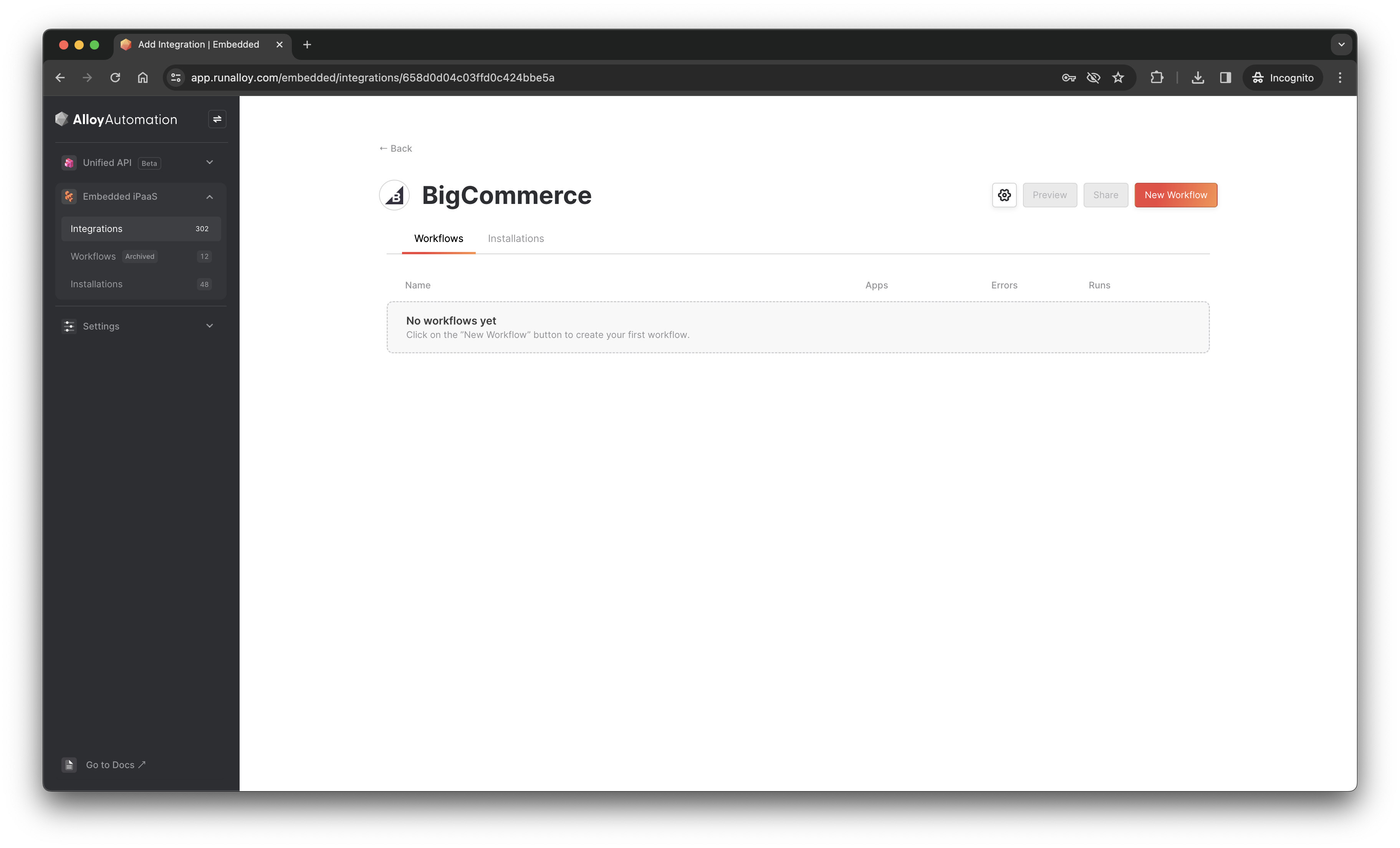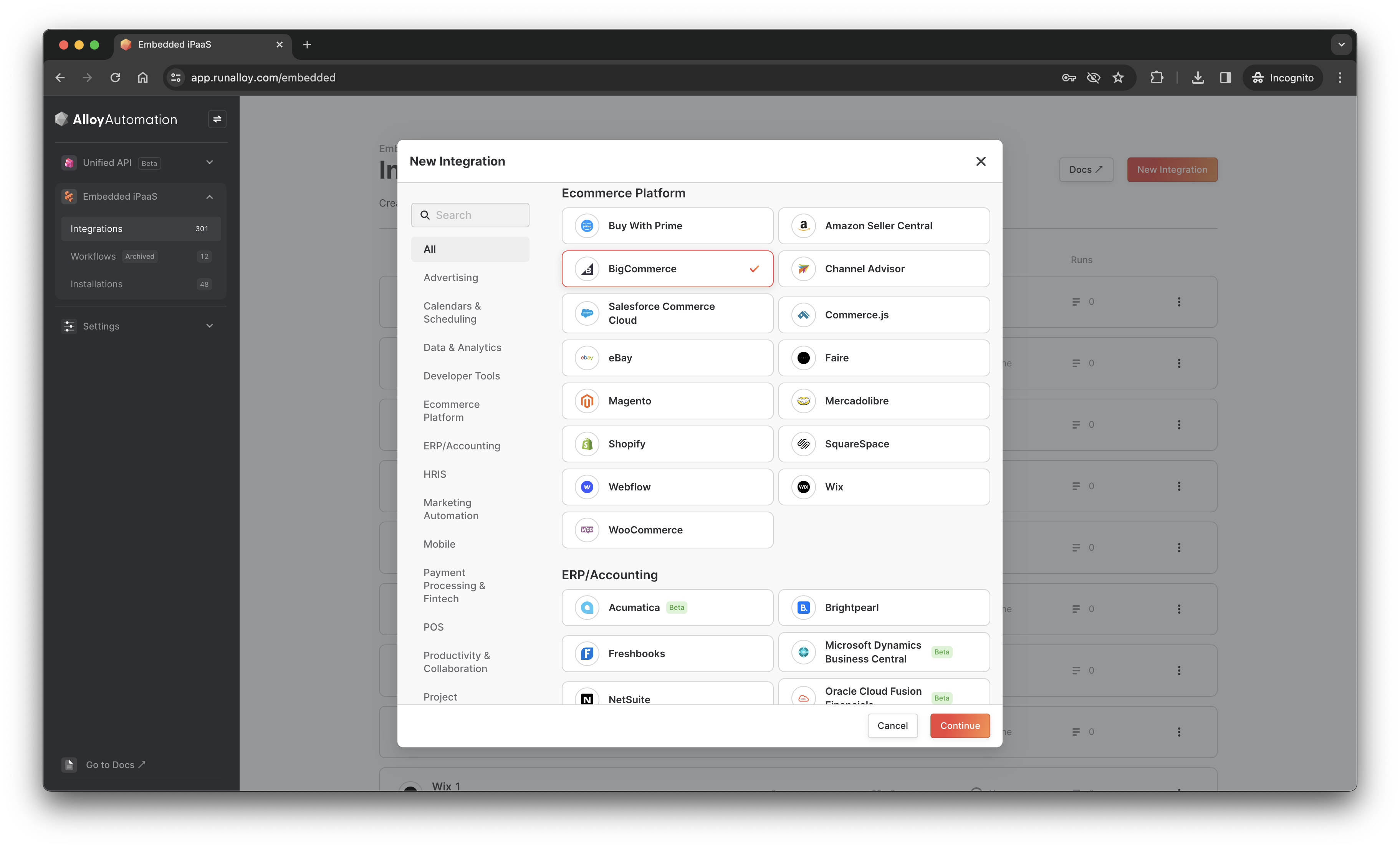 Navigate to the Alloy Embedded dashboard and select New Integration > then locate BigCommerce.