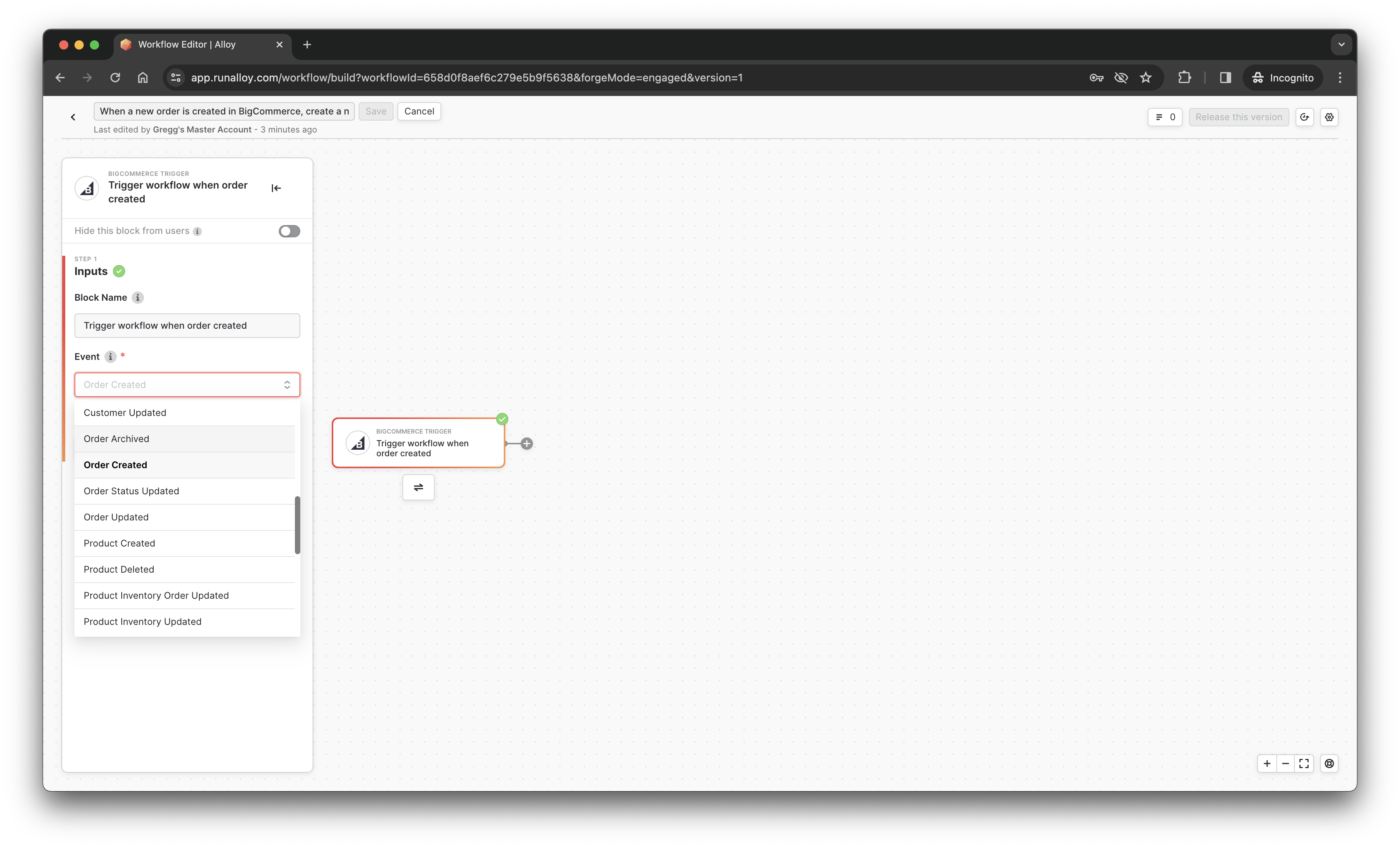Next, select BigCommerce Trigger as your event. Selecting BigCommerce as the event tells Alloy Embedded where to listen for incoming events. From the inputs section on the left hand side, select the order created event. Quite literally, you're telling Alloy Embedded to trigger this workflow each time a new order is created in your end user's BigCommerce store.