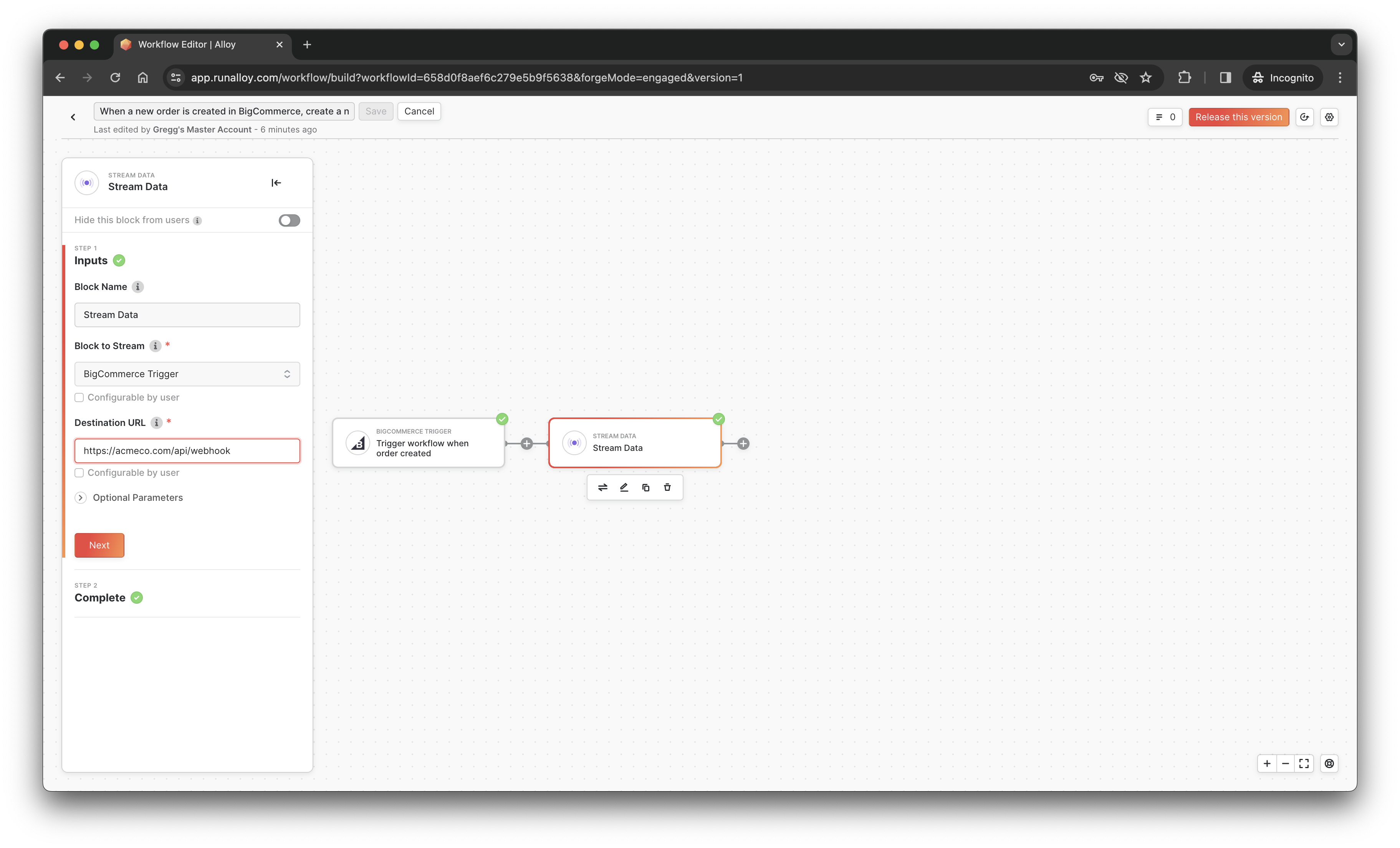 Lastly, locate the "Stream Data" block. Once you've selected it, enter the URL of the destination where you want to stream the BigCommerce order data. This URL should be a server that can accept incoming POST requests made by Alloy Embedded.