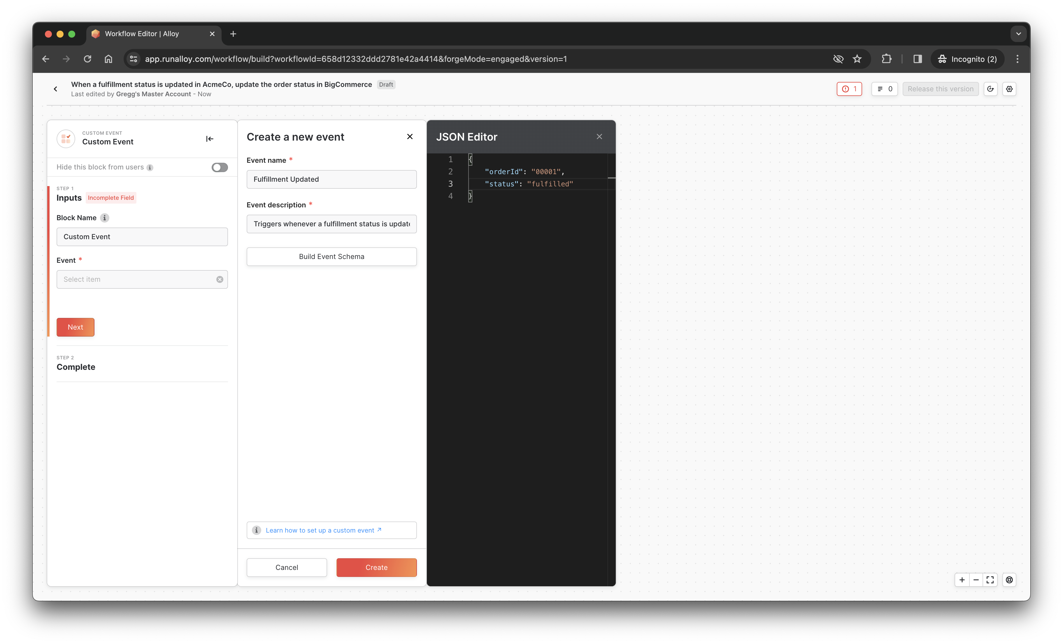 A Custom Event is a special type of event block that allows you to specify your own payload to trigger a workflow. Because we want to update an order status in BigCommerce from AcmeCo's application, we'll use Custom Event.