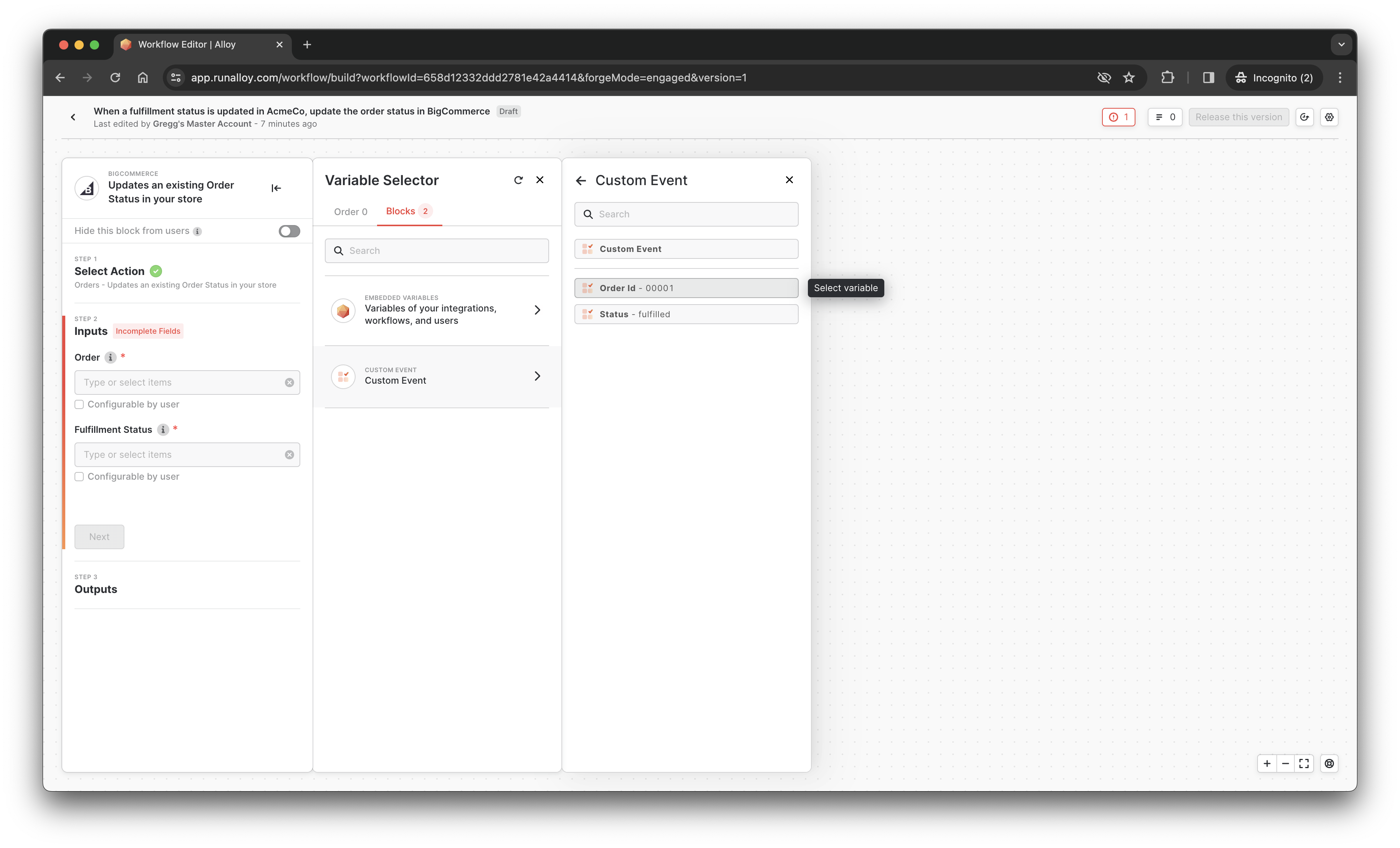 Next, select BigCommerce as your destination. Select the “update an order status" under Block Action. Then select the input parameters that will be passed to BigCommerce. This is called data mapping. Here, you'll map the orderId value from the Custom Event to the Order field in BigCommerce. Data Mapping tells Alloy Embedded which values from one app should be mapped to the other, in this case, which values from the Custom Event should be sent over to BigCommerce.