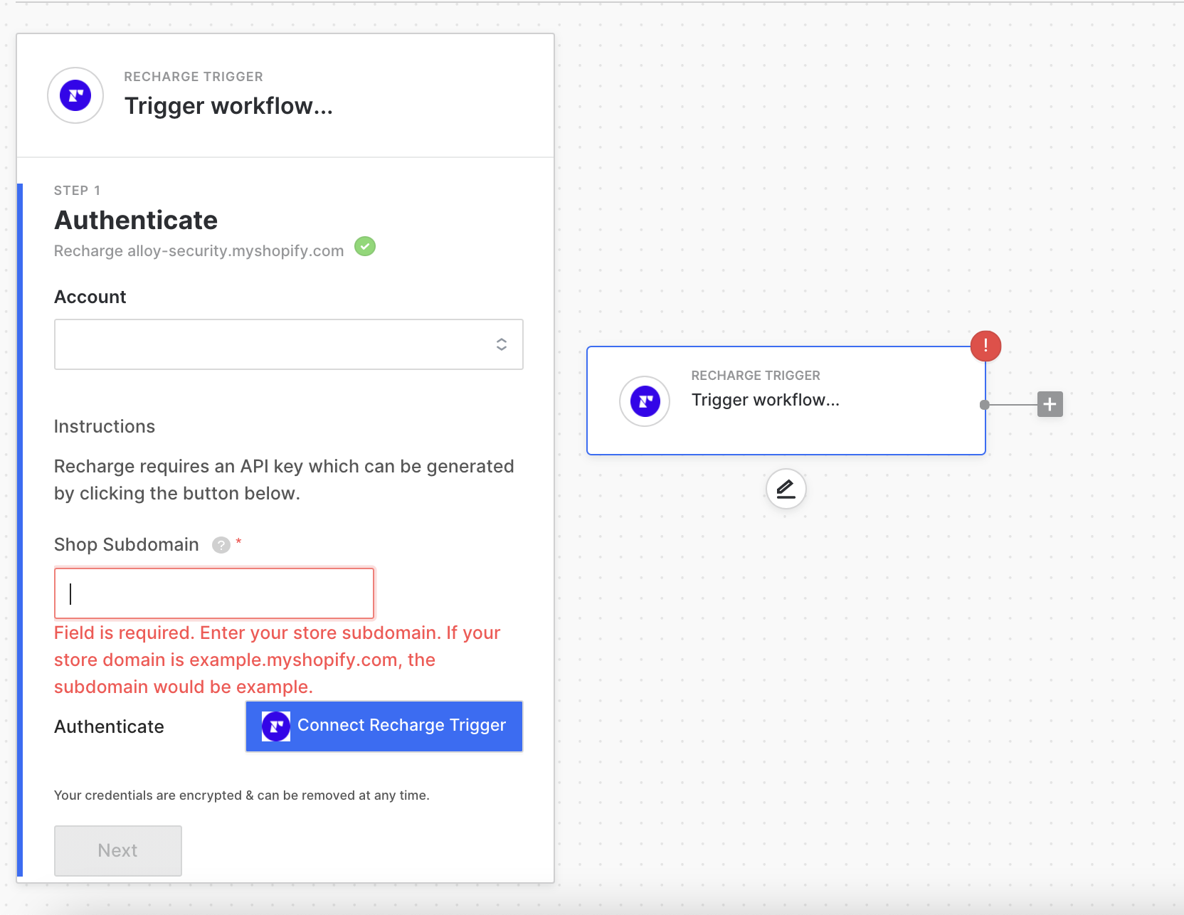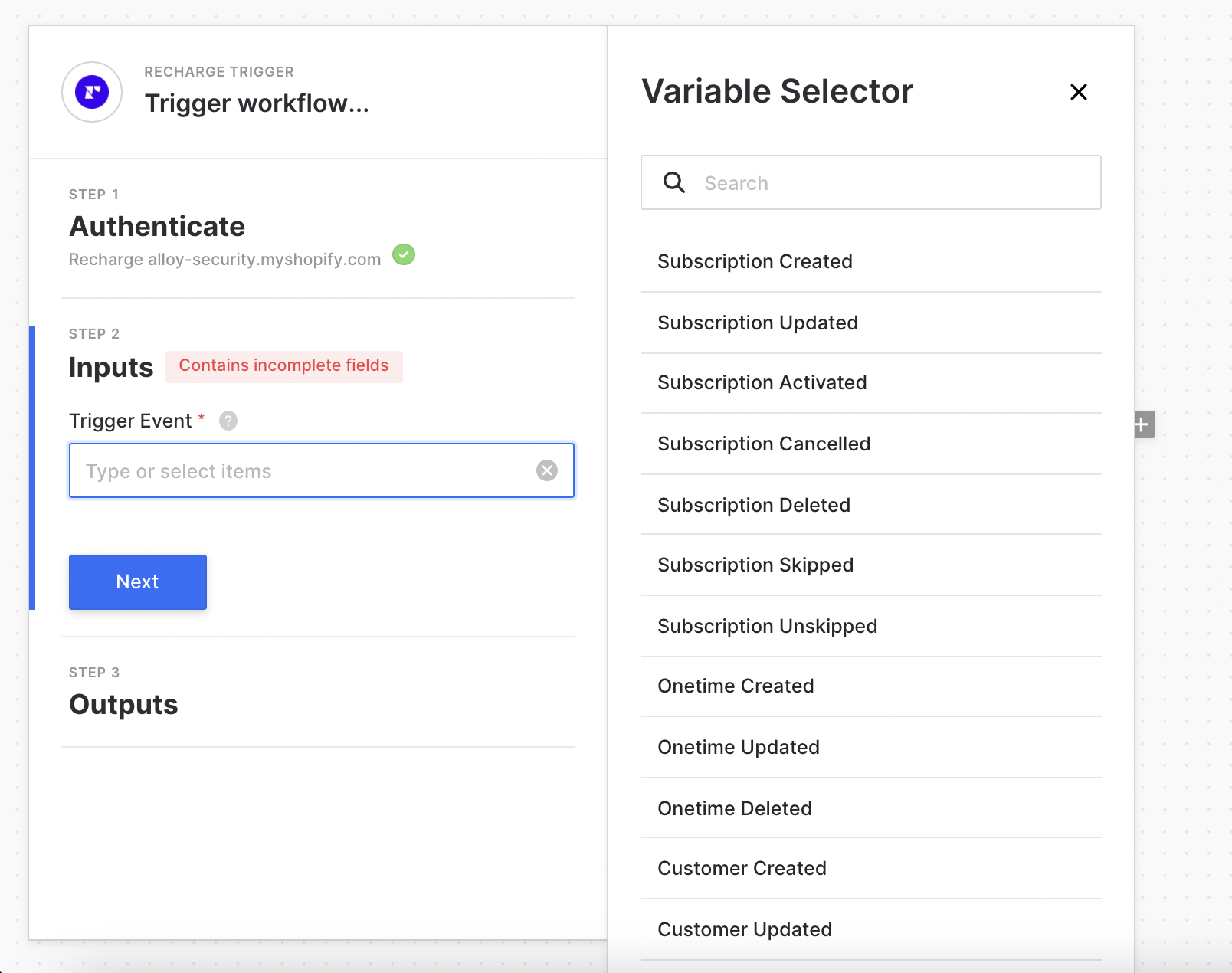 You could select ReCharge as the trigger (and any actions within ReCharge) or choose another app. First, authenticate with ReCharge