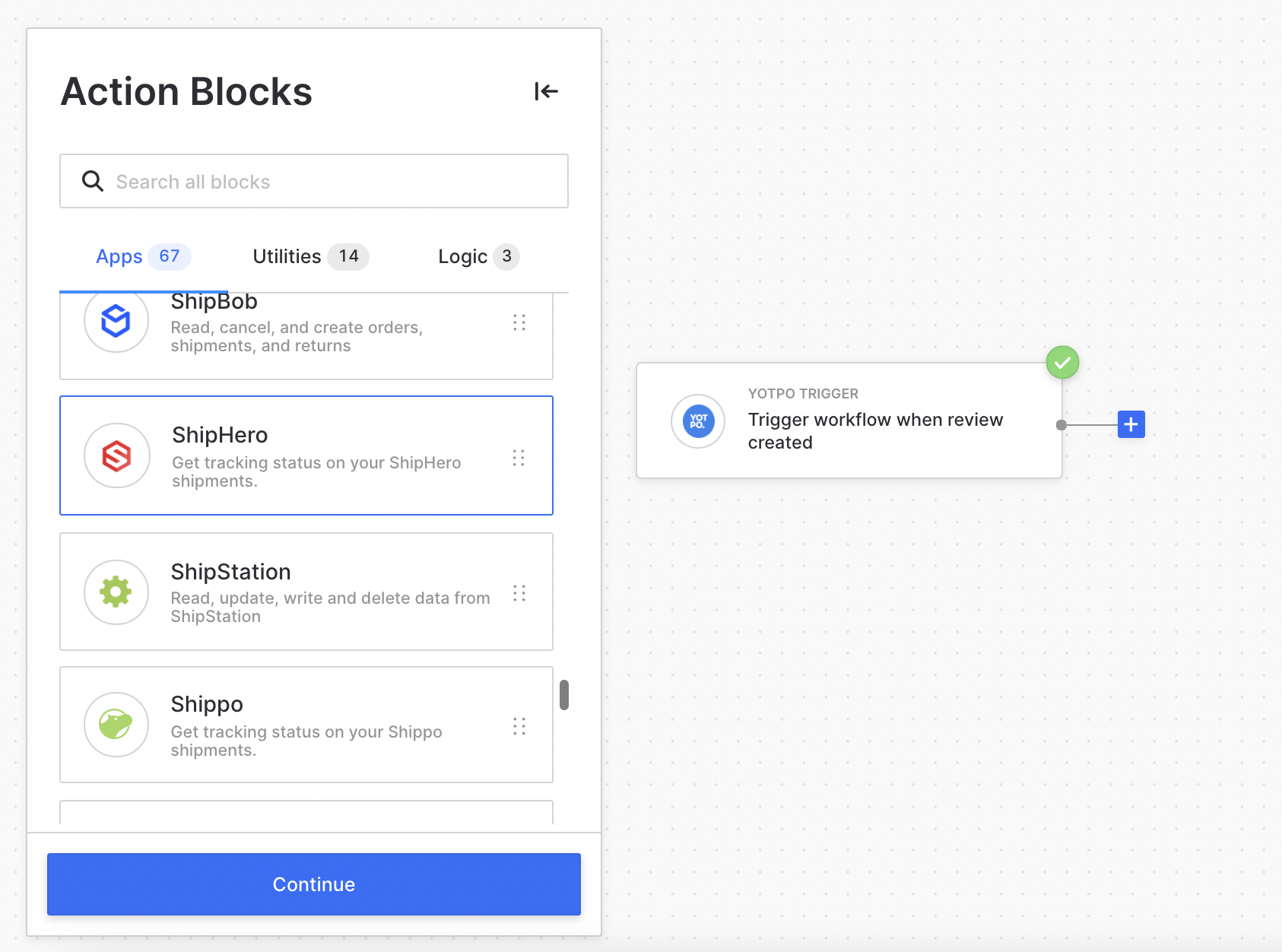 Select any app you'd like to trigger the workflow. You could select Yotpo and create a workflow that activates a reward shipment if a customer hits a certain VIP level.