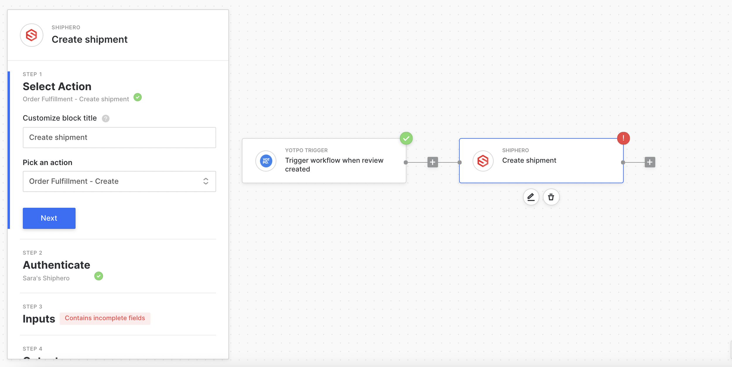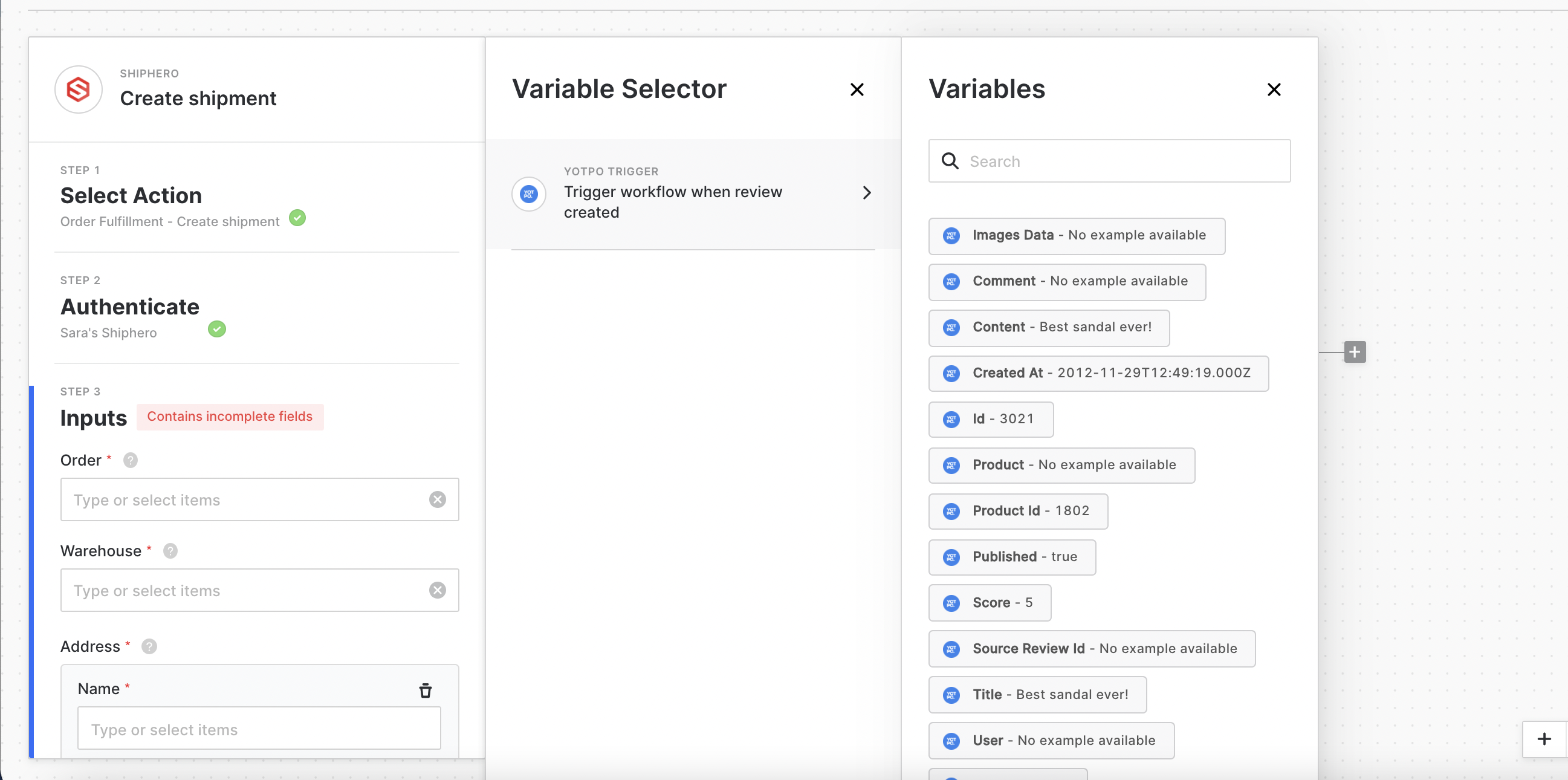 - Configure the fields in ShipHero to be what you'd like. You could grab data from the output of the Yotpo trigger to fill it in dynamically