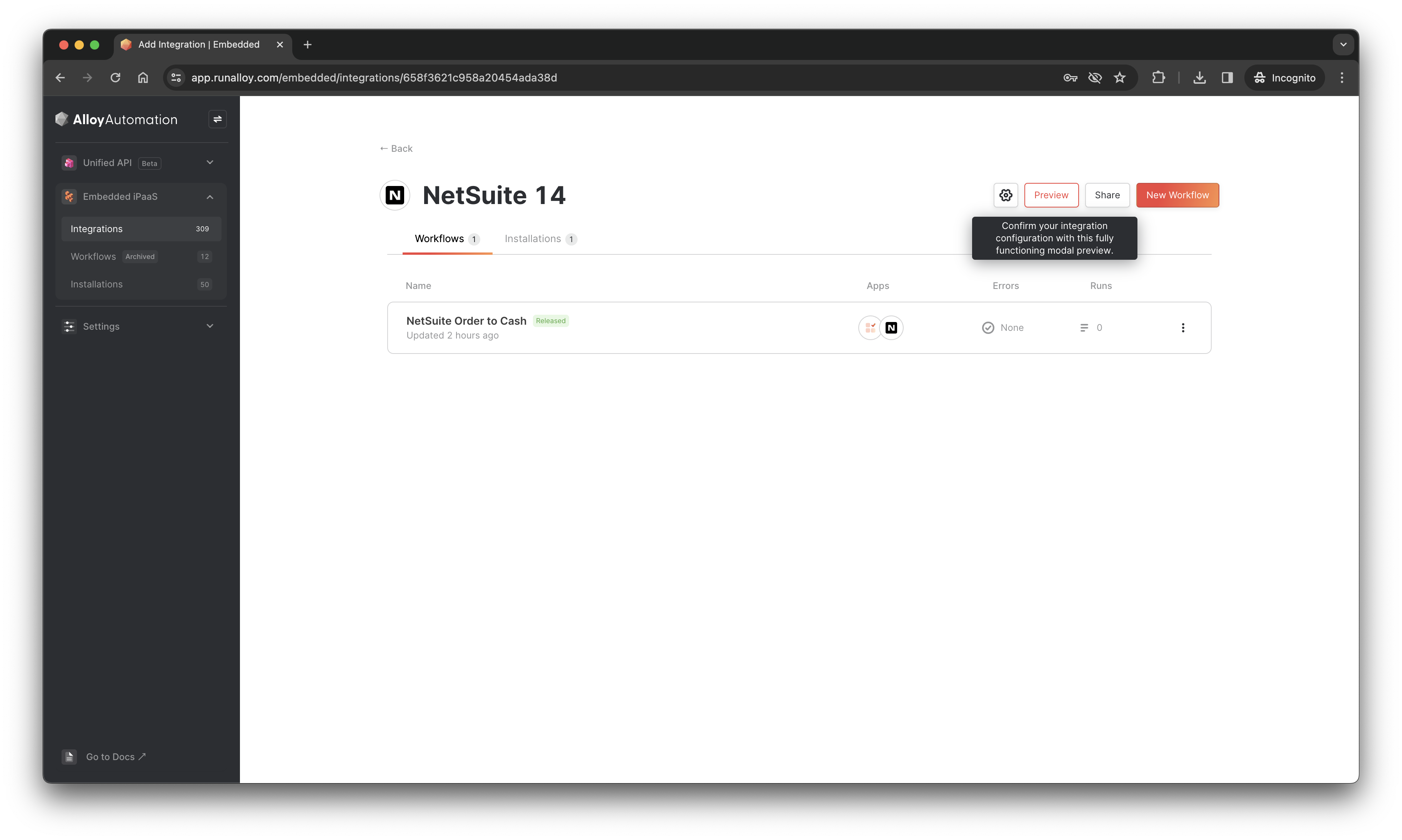To preview your changes, navigate to any integration you've built so far as seen below. Select the Preview button.