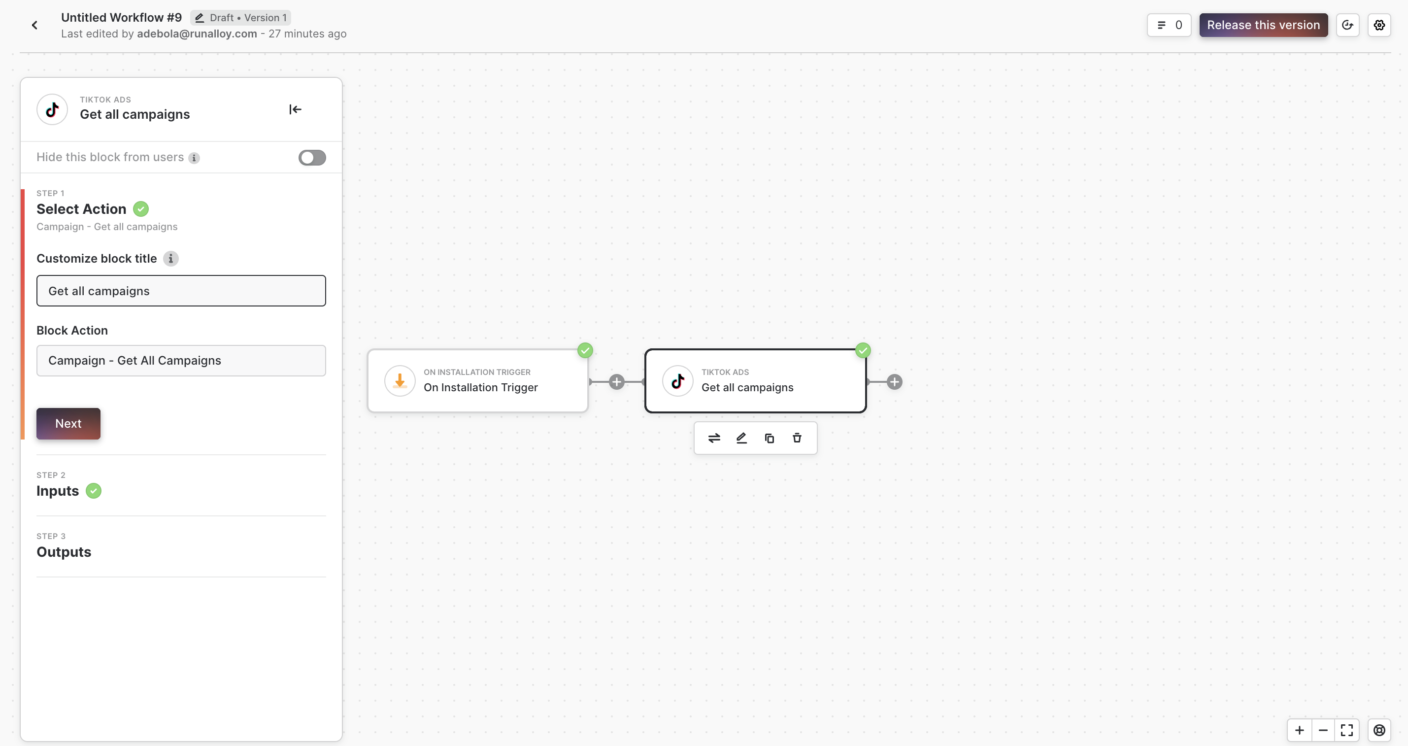Continue building your workflow and release your integration for use when complete!