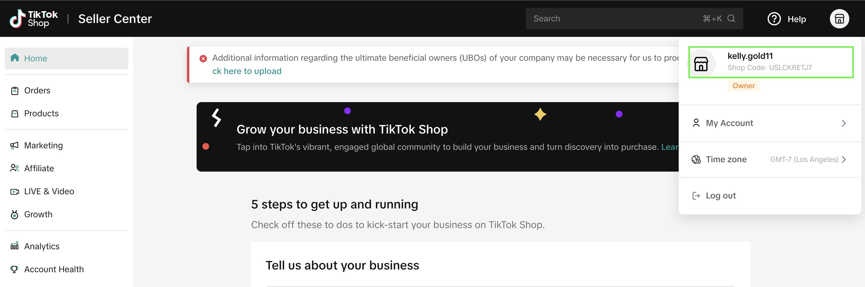 To authenticate through the Alloy embedded modal, a TikTok Shop code is required. The Shop code can be accessed by clicking the shop icon in the top right of the TikTok Shop dashboard.
