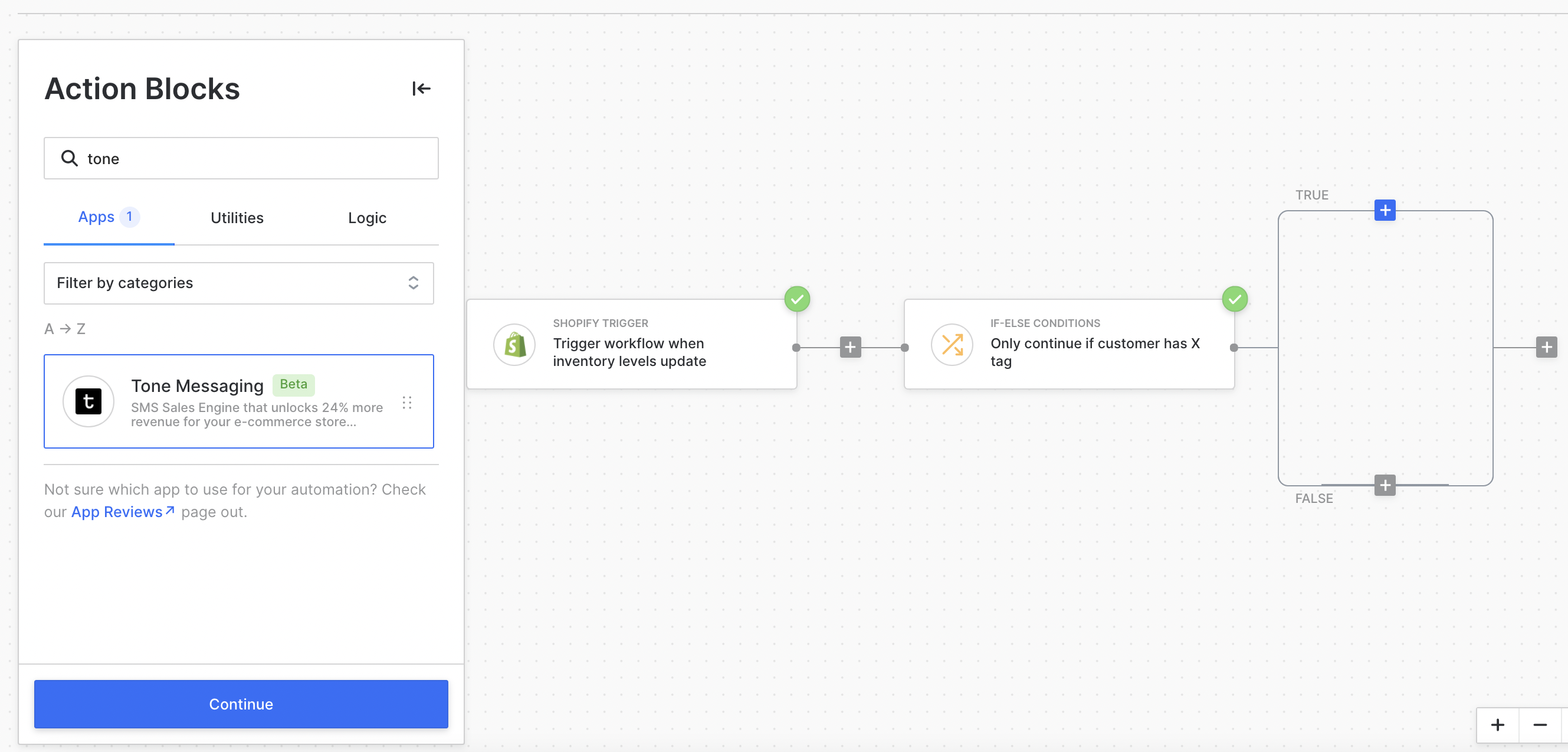 After you choose a trigger for your workflow, you can select a next block to add to your workflow. Here, you may want to add some other functionality, such as retrieving the list of customers in Shopify and filtering out certain tagged ones. This way, you can send a specific list of customers a SMS notification through Tone.