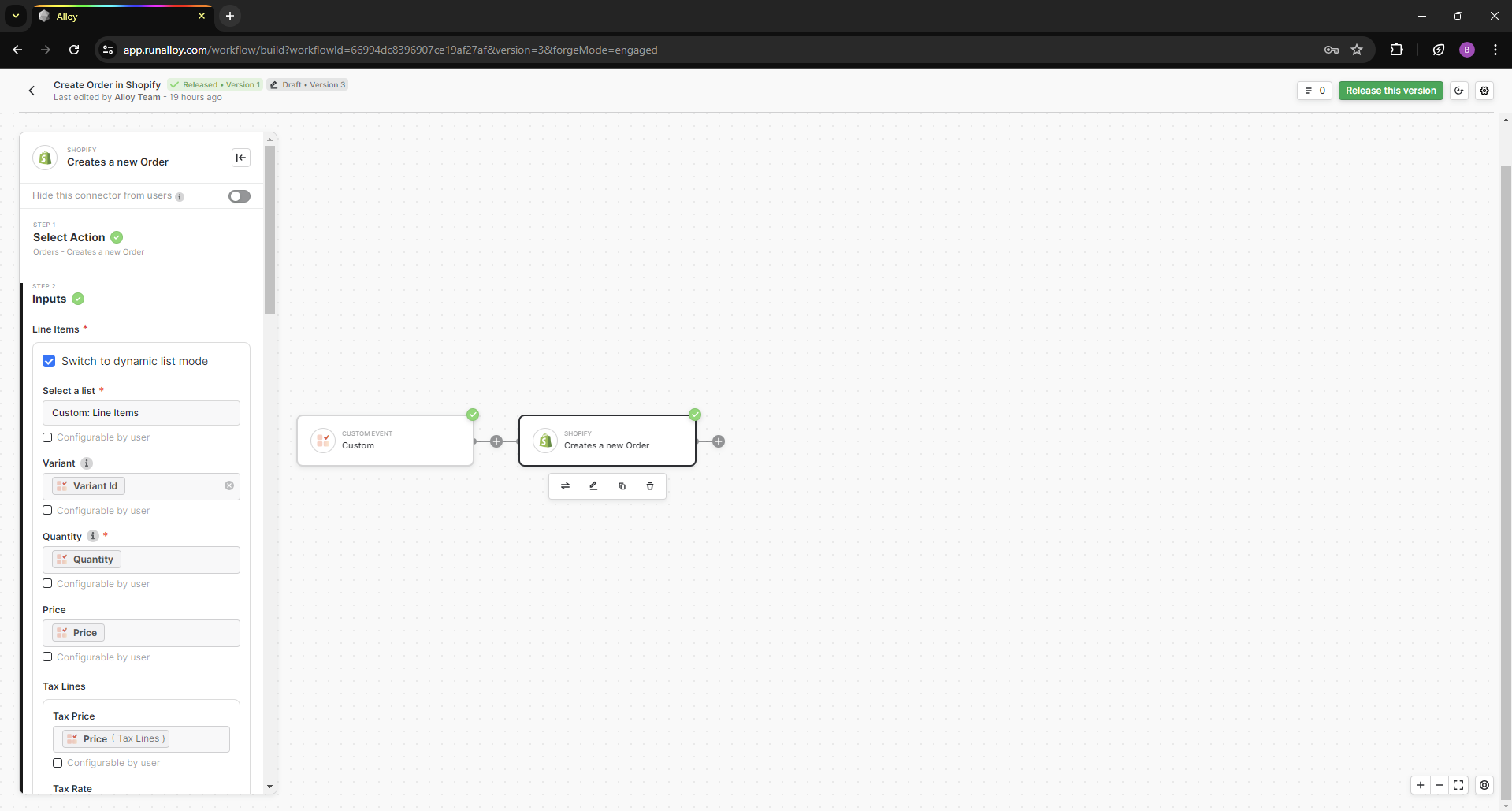 - Next, we set up a workflow to push Order created events to Alloy and create that order inside of your e-commerce system.
