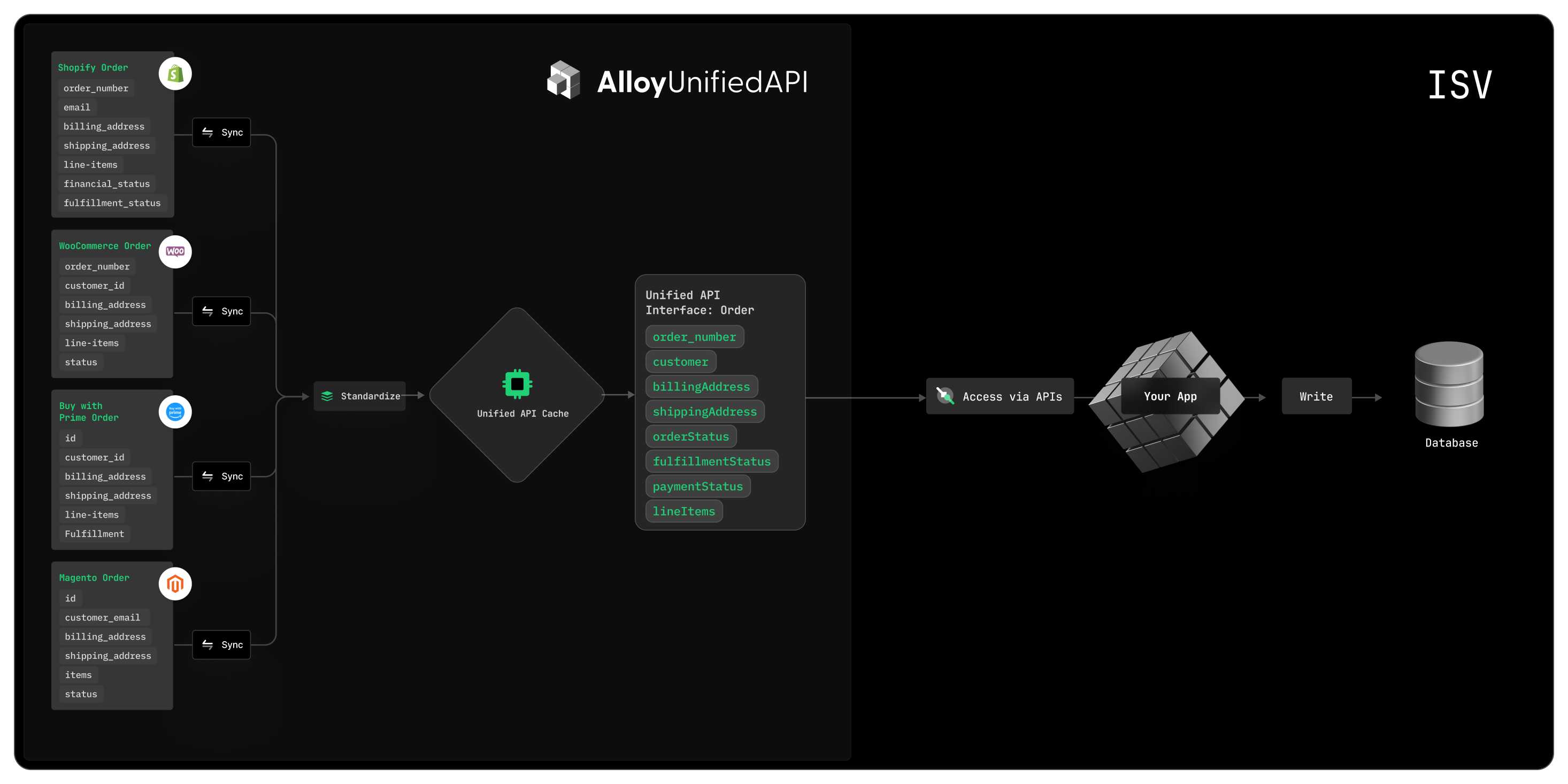 When an ISV queries the Alloy UAPI to fetch the financial data needed to underwrite the loan, all that data is instantly accessible at your fingertips. With Alloy Unified API, the data for one app is consistent across others, meaning that you can build a Shopify integration in minutes and instantly roll that out for Magento, BigCommerce, Amazon, Etsy, and others with virtually no additional work!